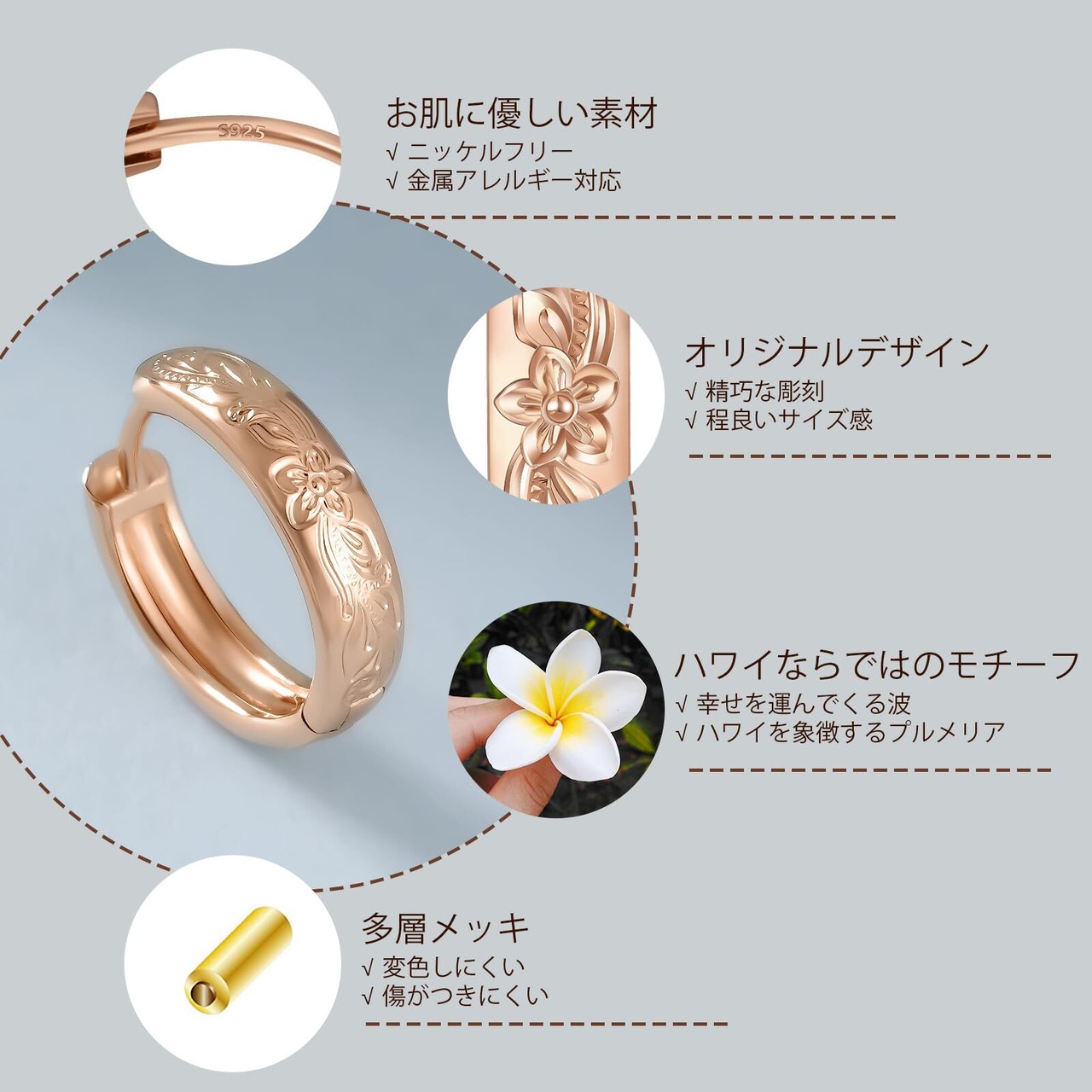 KRKC&CO フープピアス ハワイアンジュエリー メンズピアス 15mm プルメリア 彫り リングぴあす 両耳 金属アレルギー対応 14金メッキ シルバーピアス 男女兼用 シンプル おしゃれ