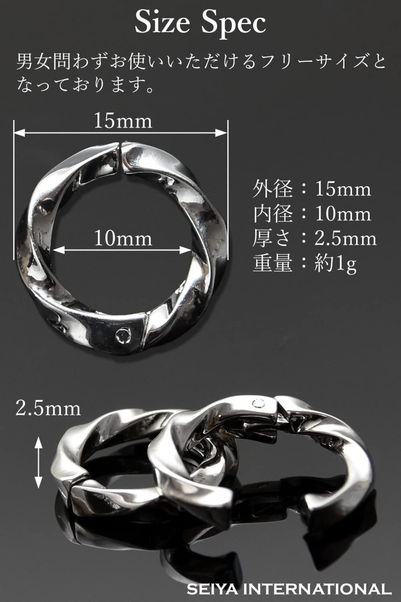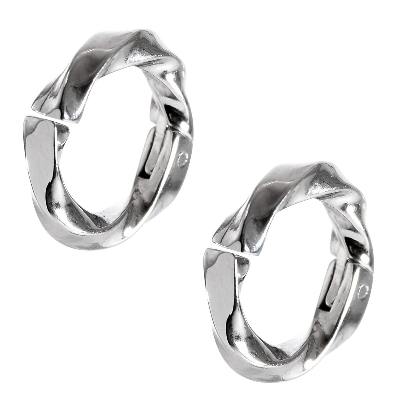 【 おしゃれなデザイン 】フープタイプにツイスト(ねじり)を加えどの角度から見てもキラキラと高級感のある輝きを放つツイストフープイヤリング、シンプルなフェイクピアスに飽きてしまった方や周りと差をつけたい方におすすめのアクセサリーです。ツイストフープフェイクピアスはメンズだけではなく、レディースにもお使いいただけます。光の反射により輝きを放ち、ねじりを効かせたデザインがあなたの耳元をおしゃれに演出します。耳に直接触れる部分は耳への負担が少なく外れにくい平らなフラット加工をしております。フープイヤリングのサイズは外径15mm 内径10mmフープイヤリングの厚さは約2.5mm 重さは約1グラムになります。カラーはシルバー ブラックからお選びください。