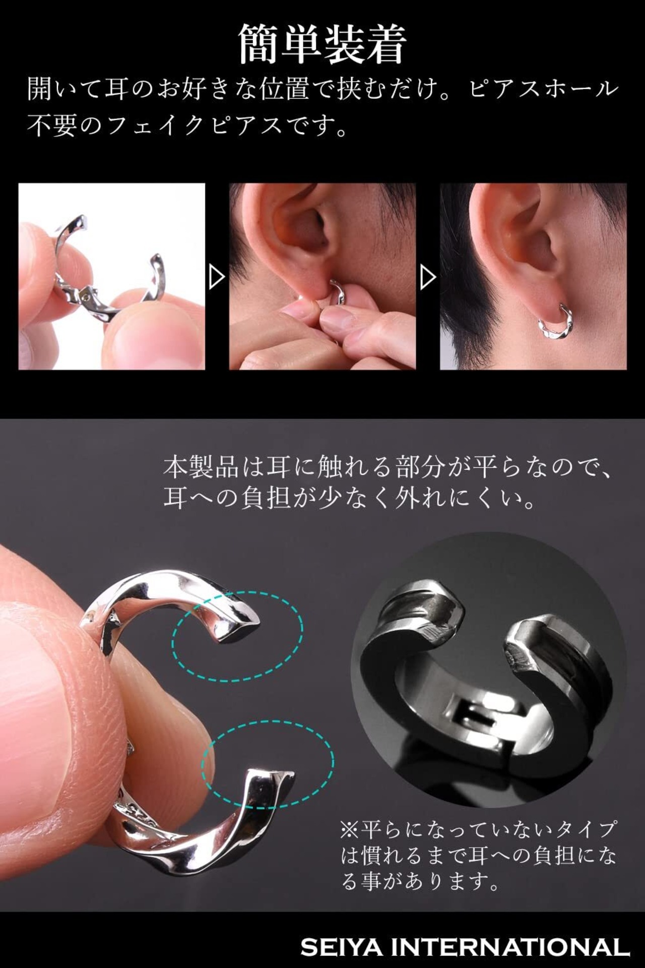 【 ピアス穴がいらないフェイクピアス 】耳にピアス穴が開いていなくてもおしゃれを楽しめるフェイクピアスです。もちろんピアスホールは必要ありません。フェイクピアスは穴を開けないピアスで穴なしピアス、ノンホールピアス、穴開けないピアス、偽ピアスなどと呼ばれています。耳に挟んでとめるだけで簡単に装着でき、普通のピアスと変わらない見た目で周りから疑われることなくフェイクピアスを存分に楽しんで頂けます。今までできなかった耳元のおしゃれをこのフェイクピアスで始めてみてはいかがでしょうか。