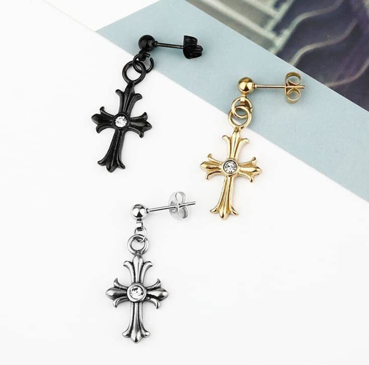 【デザイン】片耳用1つ入り 定番クロスデザイン ピアス / 定番の十字架モチーフに、中央で輝くCZダイヤをプラスした、洗練されたデザインのピアス。シルバー・ブラック・ゴールドの3色展開で、スタイルやシーンに合わせて選べる人気アクセサリーです。