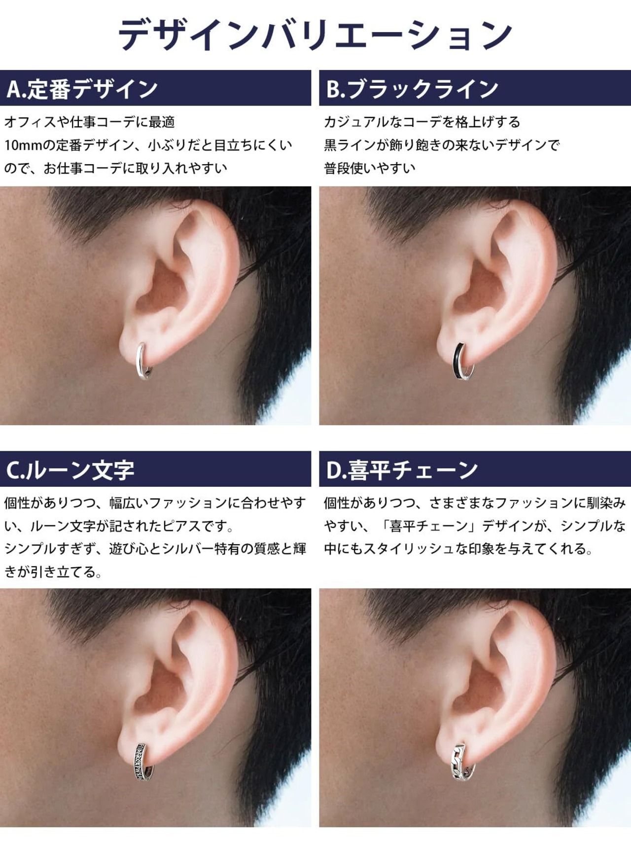 【豊富なバリエーション】リングピアスはシルバーとブラックの人気2色、4種類デザインをご用意しております。スタイリッシュな印象のシンプルデザインから個性的デザインまでお好みのピアスをお選びいただけます。