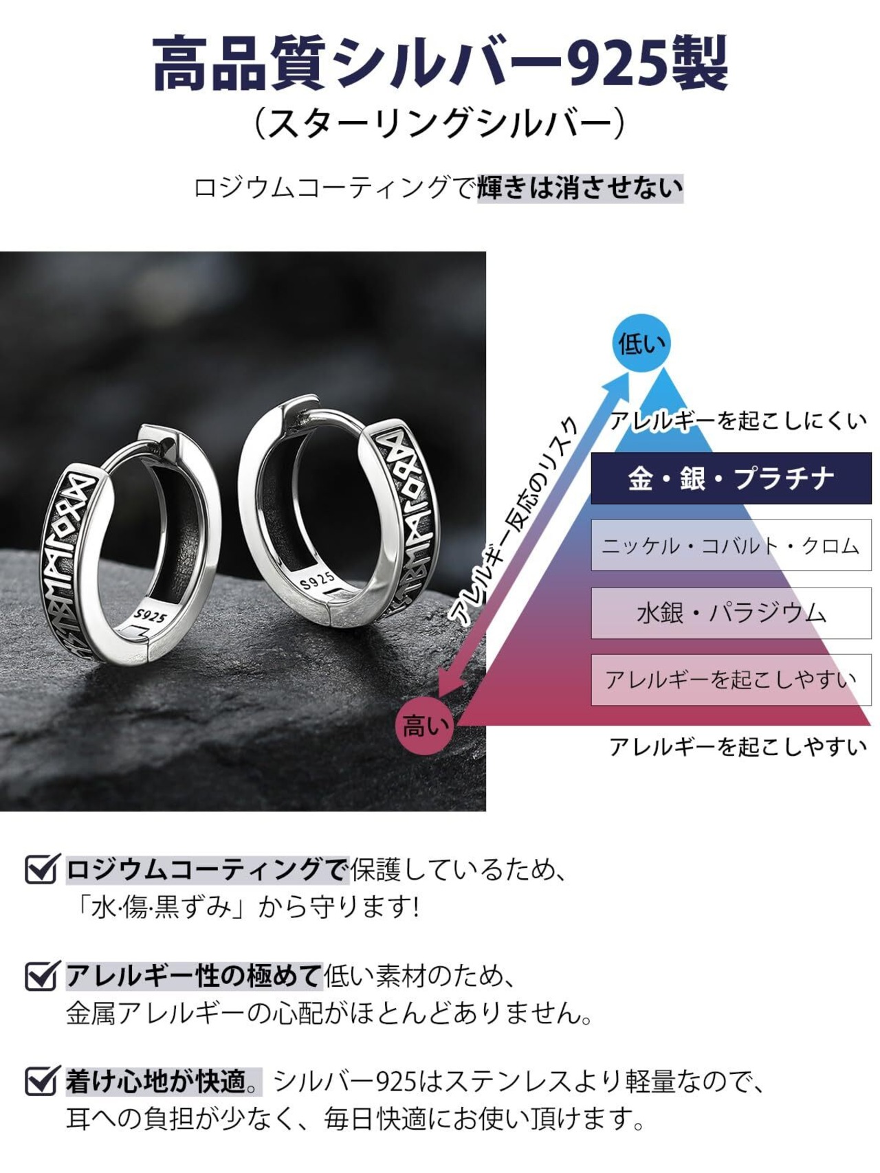 【お肌にやさしい シルバー925ピアス】地金はシルバー925(スターリングシルバー)を採用し、ブラックや強度が高いロジウムコーティングで変色防止の効果があります。錆びにくく、いつでもプラチナのような美しく輝、金属アレルギーになりにくい点が特徴です。シルバー925はステンレスより軽量なので、耳への負担が少なく、毎日快適にお使い頂けます。