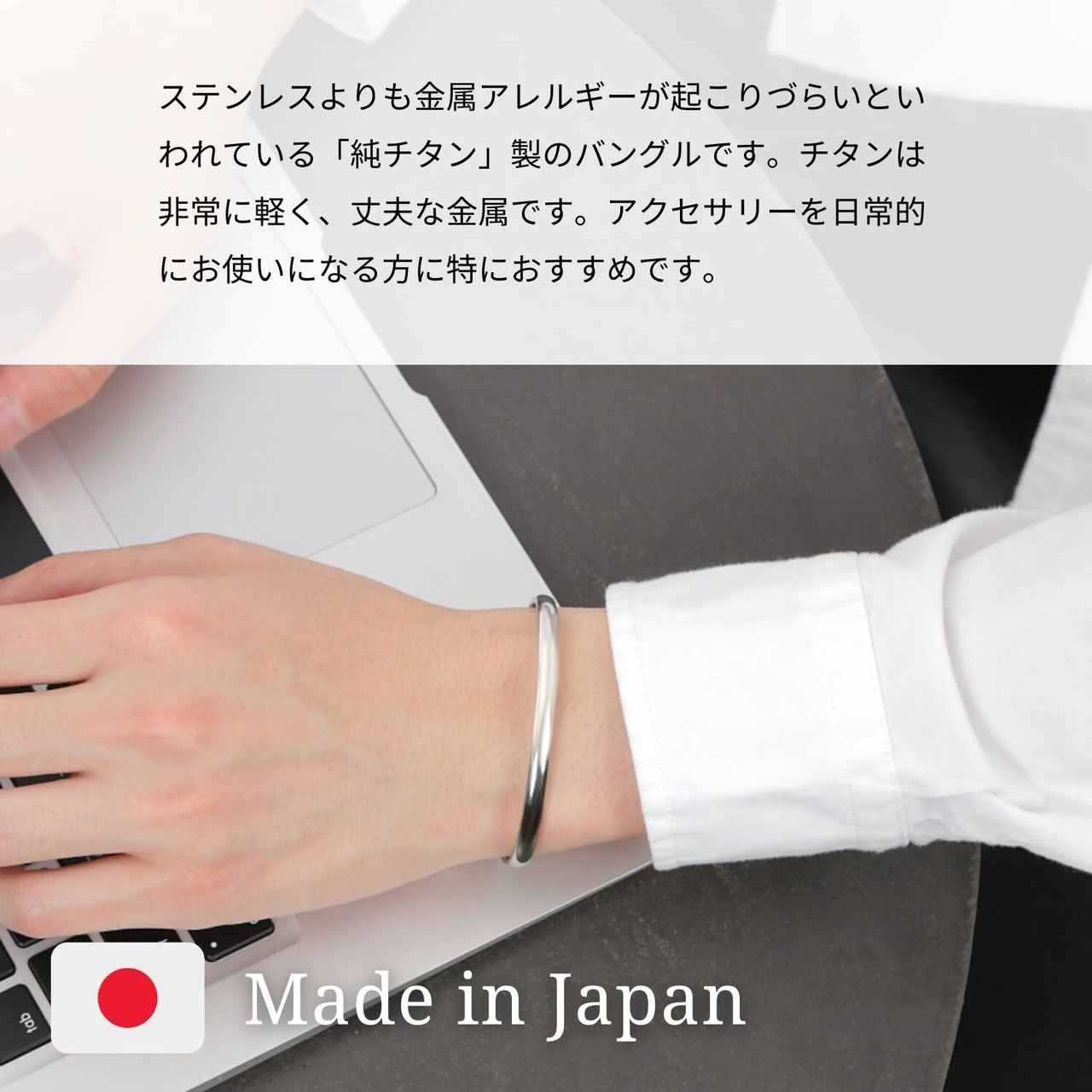 【MIDI・純チタン製バングル】金属アレルギーやお肌が弱い方・敏感肌の方にも使いやすい「純チタン」製のバングルです。金属アレルギーに配慮した場合、サージカルステンレスよりもチタンのほうが安全だといわれています。金やプラチナより軽く、非常に丈夫な素材です。