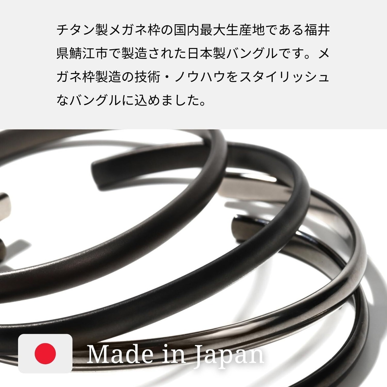 【あんしんの日本・鯖江製】メガネ枠の国内最大生産地である福井県鯖江市ですべての加工を行っています。チタン製メガネ枠の技術を活かして、スタイリッシュなバングルを製作しました。