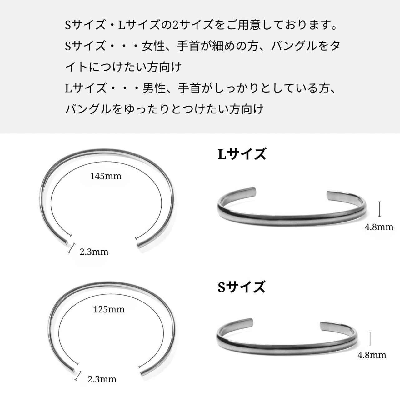 【2種類のサイズバリエーション】Sサイズ・Lサイズの2サイズをご用意しております。Sサイズ・・・女性、手首が細めの方、バングルをタイトにつけたい方向け、Lサイズ・・・男性、手首がしっかりとしている方、バングルをゆったりとつけたい方向け
