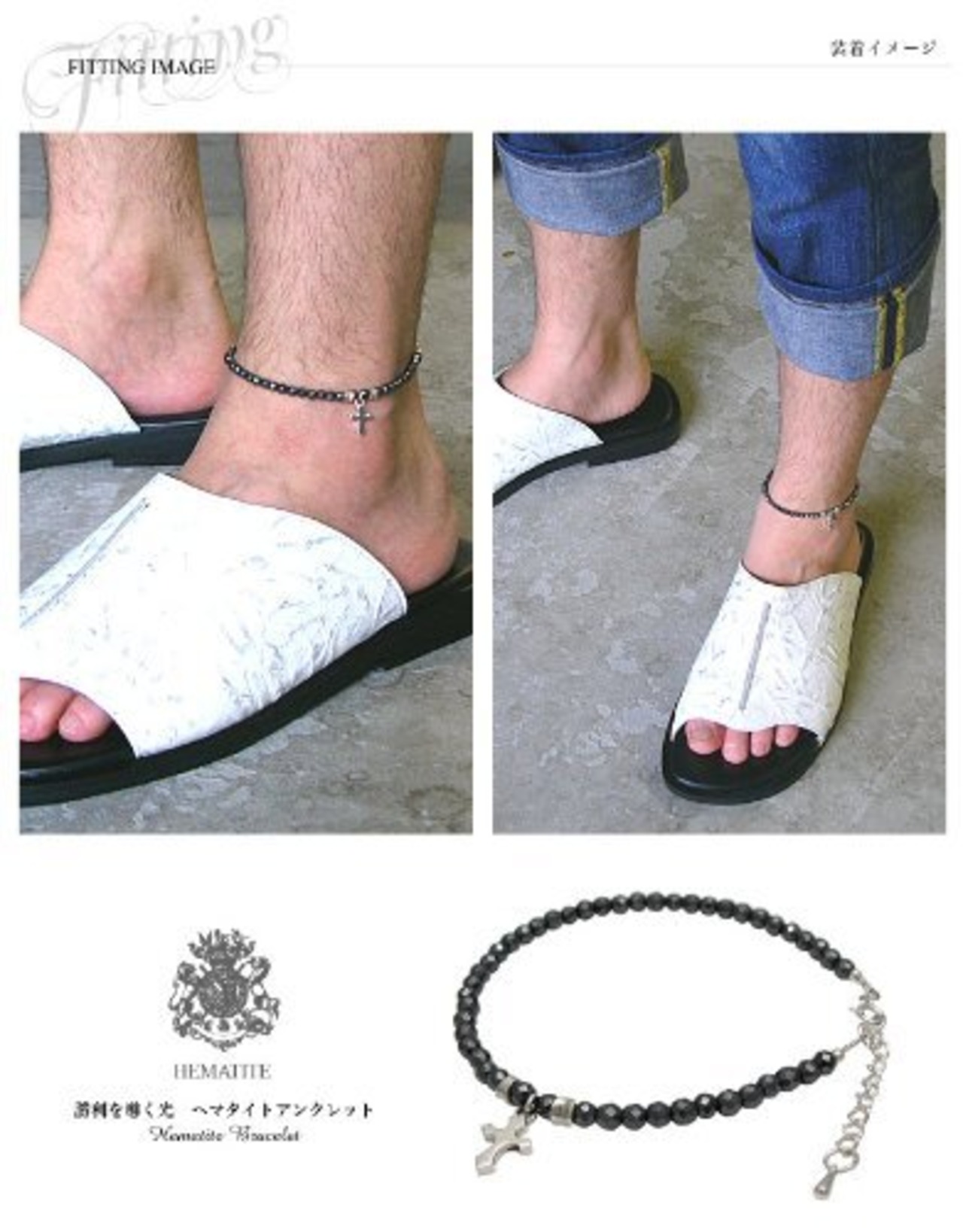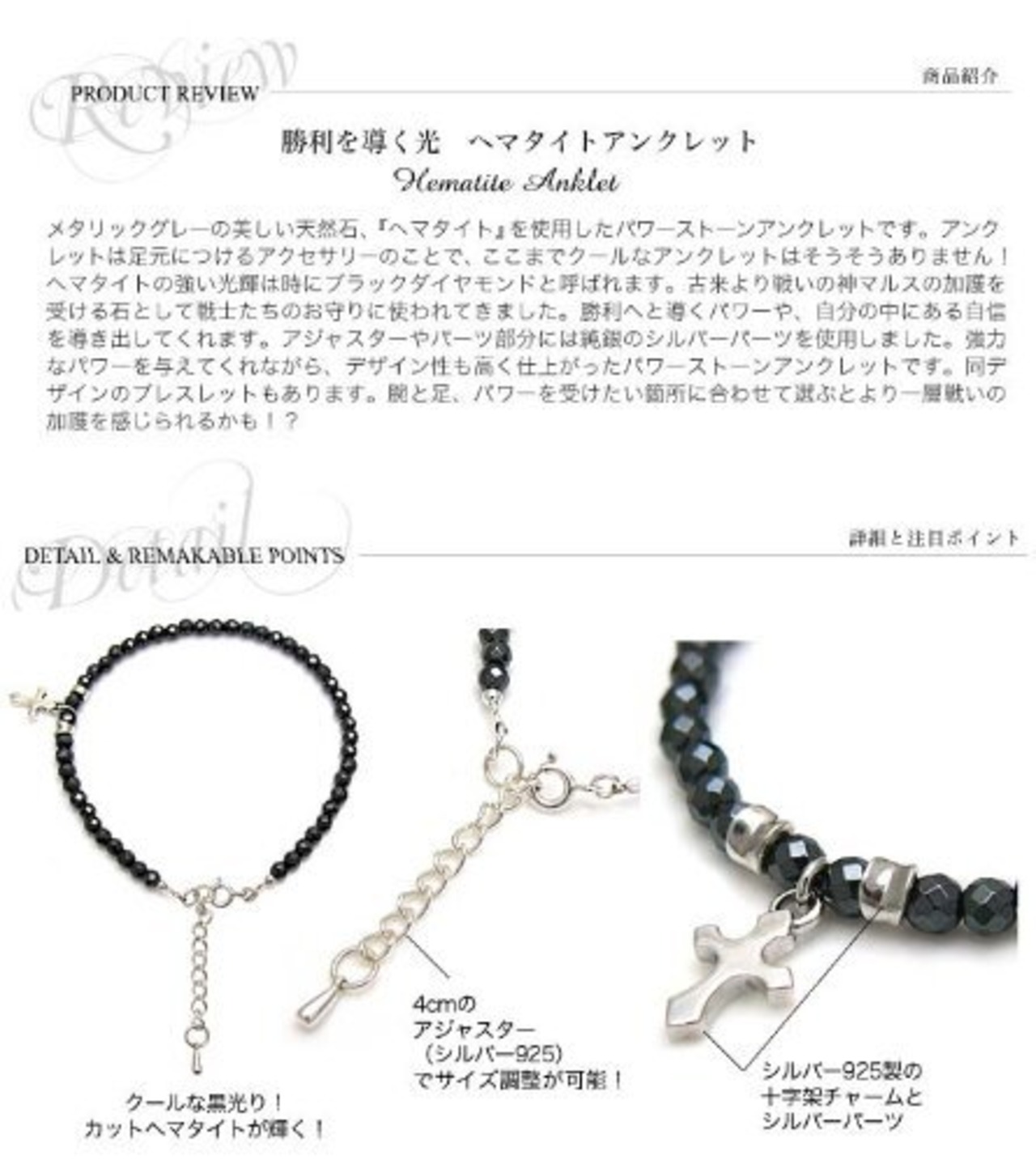 アンクレットは足元につけるアクセサリーのことで、ここまでクールなアンクレットはそうそうありません!ヘマタイトの強い光輝は時にブラックダイヤモンドと呼ばれます。古来より戦いの神マルスの加護を受ける石として戦士たちのお守りに使われてきました。勝利へと導くパワーや、自分の中にある自信を導き出してくれます。アジャスターやパーツ部分には純銀のシルバーパーツを使用しました。強力なパワーを与えてくれながら、デザイン性も高く仕上がったパワーストーンアンクレットです。