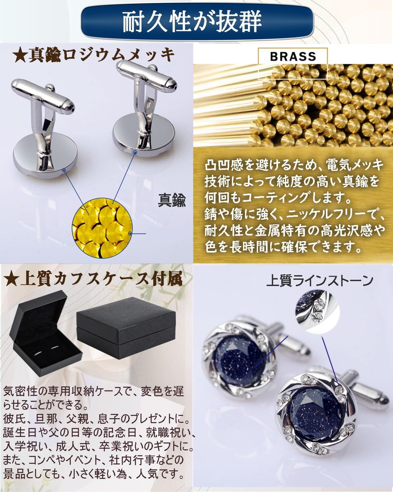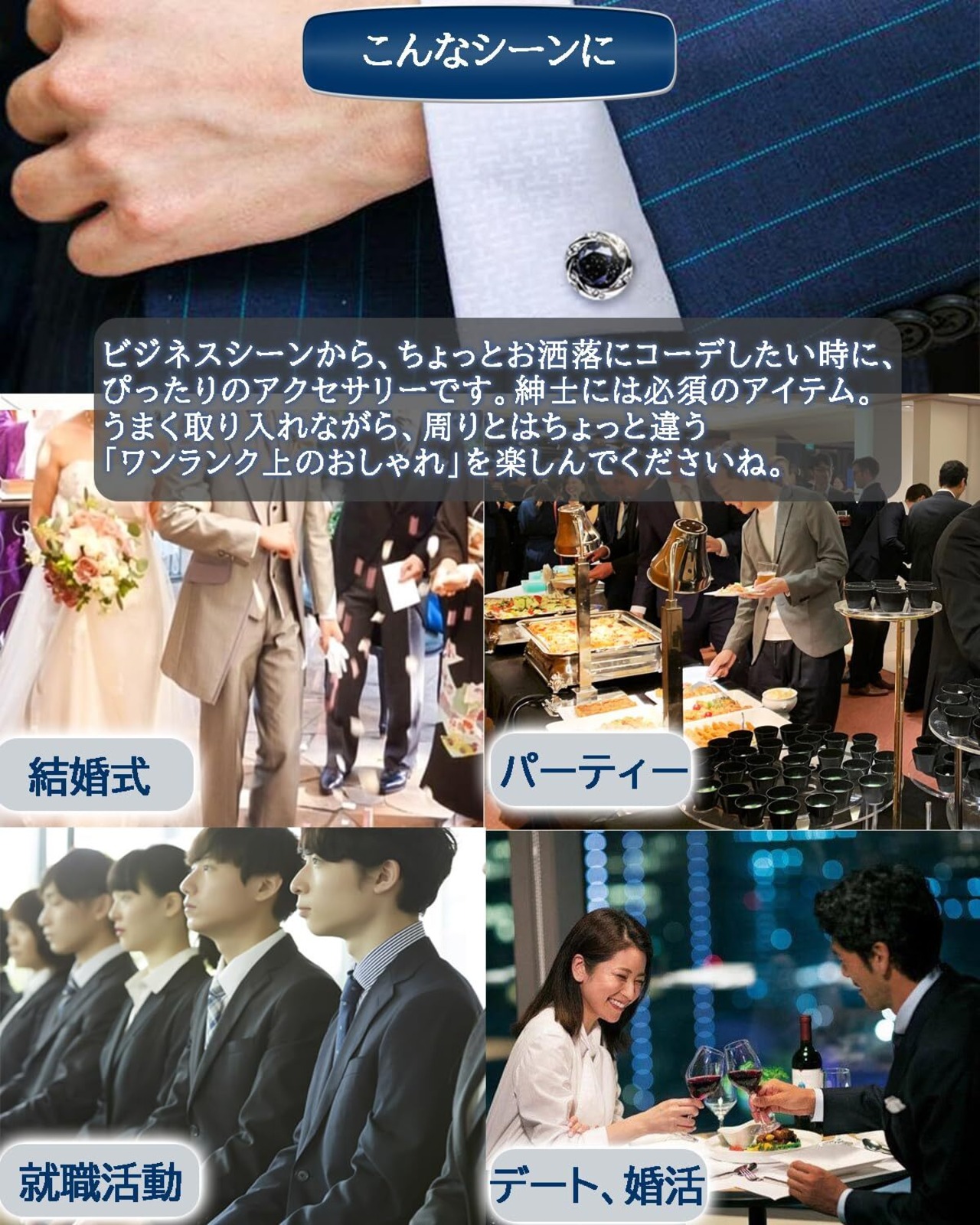 【幅広い場合に適応】結婚式、日常、ビジネス、就職祝い、入学祝い、卒業祝いなど特別な機会に最適なカフリンクス。ビジネスマンでも、ネクタイ、腕時計などにはこだわっても、カフスにまでこだわる人は少なく、他人と差を付けることができます。16mmと存在感があり、やや派手な印象がありますが、袖口から覗く綺麗な輝きに注目が集まります。見る角度や光の加減によって表情が変わる美しさが魅力。不思議な色合い。袖口のアクセントとして、活躍してくれそうです。