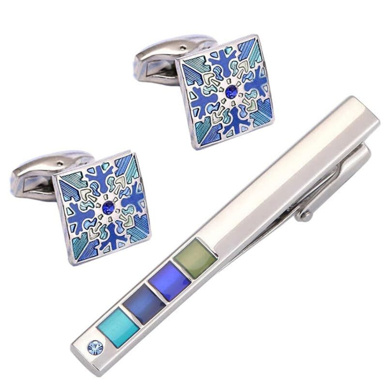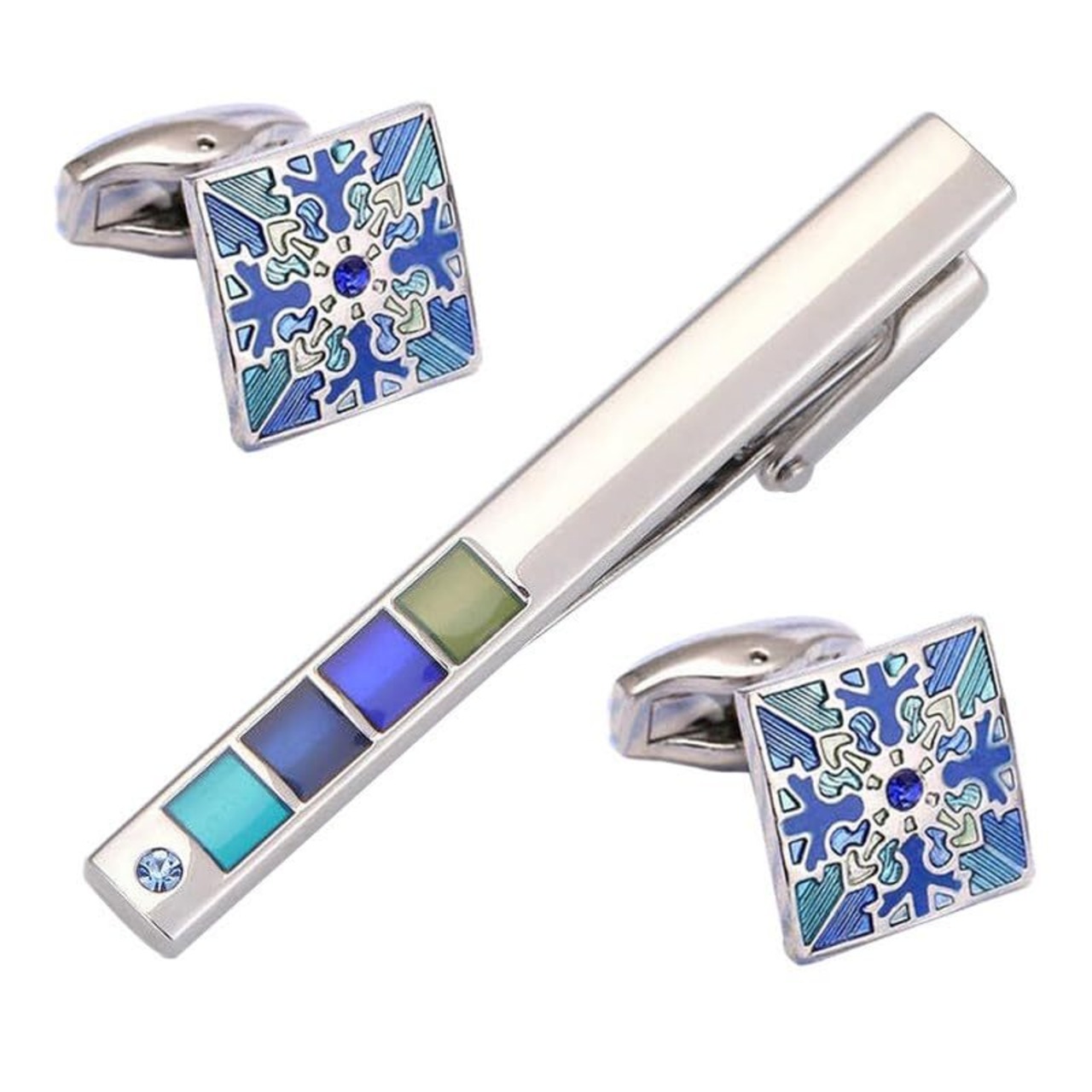Rockyu タイピン カフス セット 結婚式 メンズ シルバー スクエアモチーフ ブルーエナメル 銅製 クリスタル装飾 ビジネス フォーマル ギフト 父の日 プレゼント