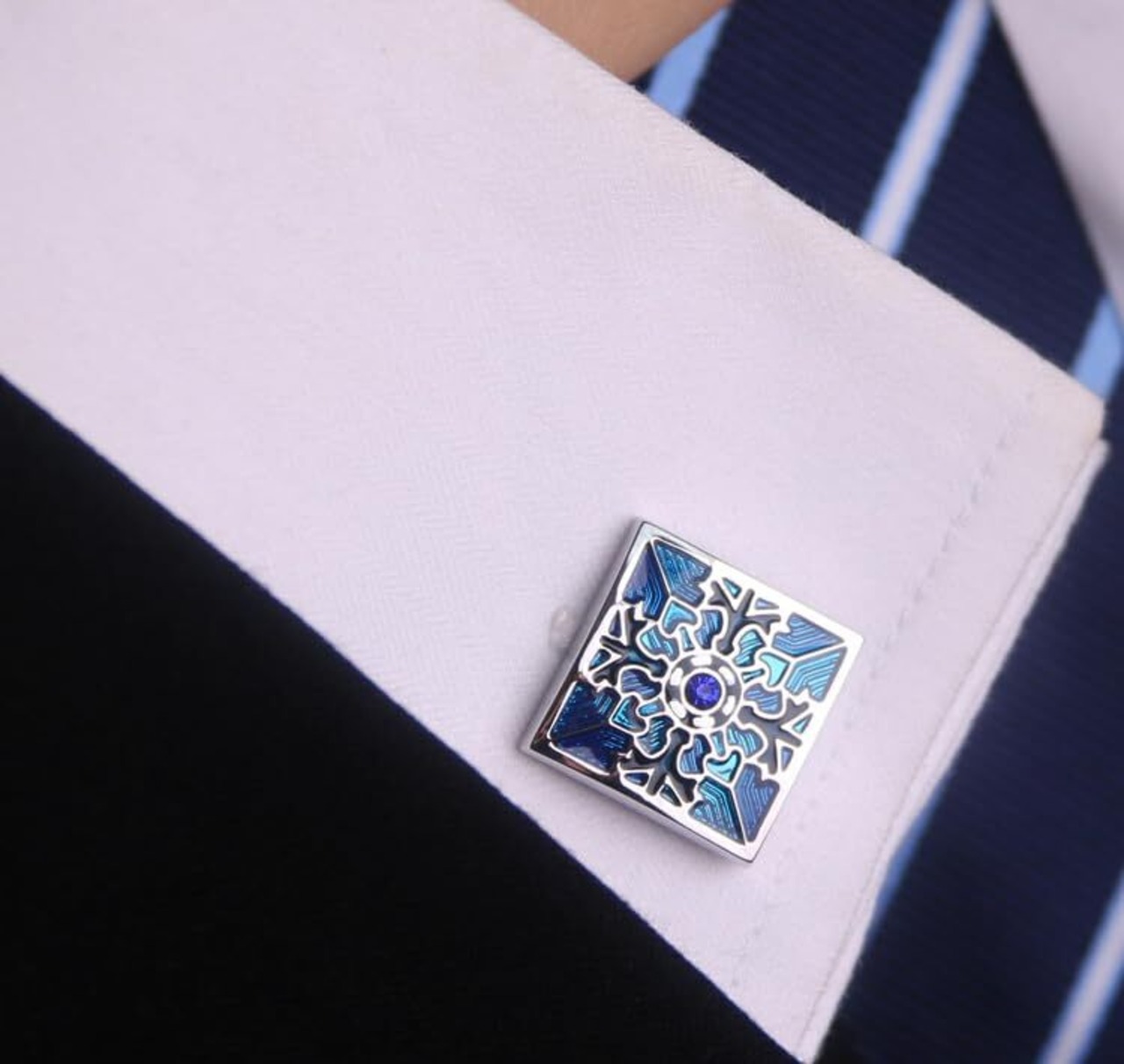 【スクエアモチーフのカフス】美しいブルーエナメルが施されたスクエア形カフス。中央にはクリスタルが輝き、フォーマルな装いに華やかさをプラスします。デザイン性と品格を兼ね備えています。
