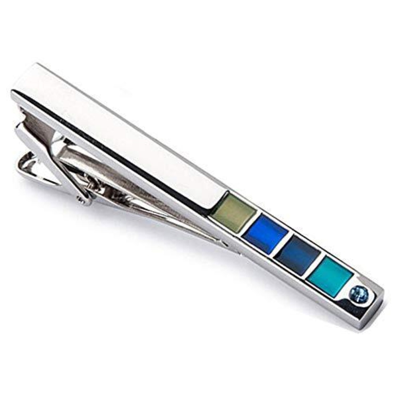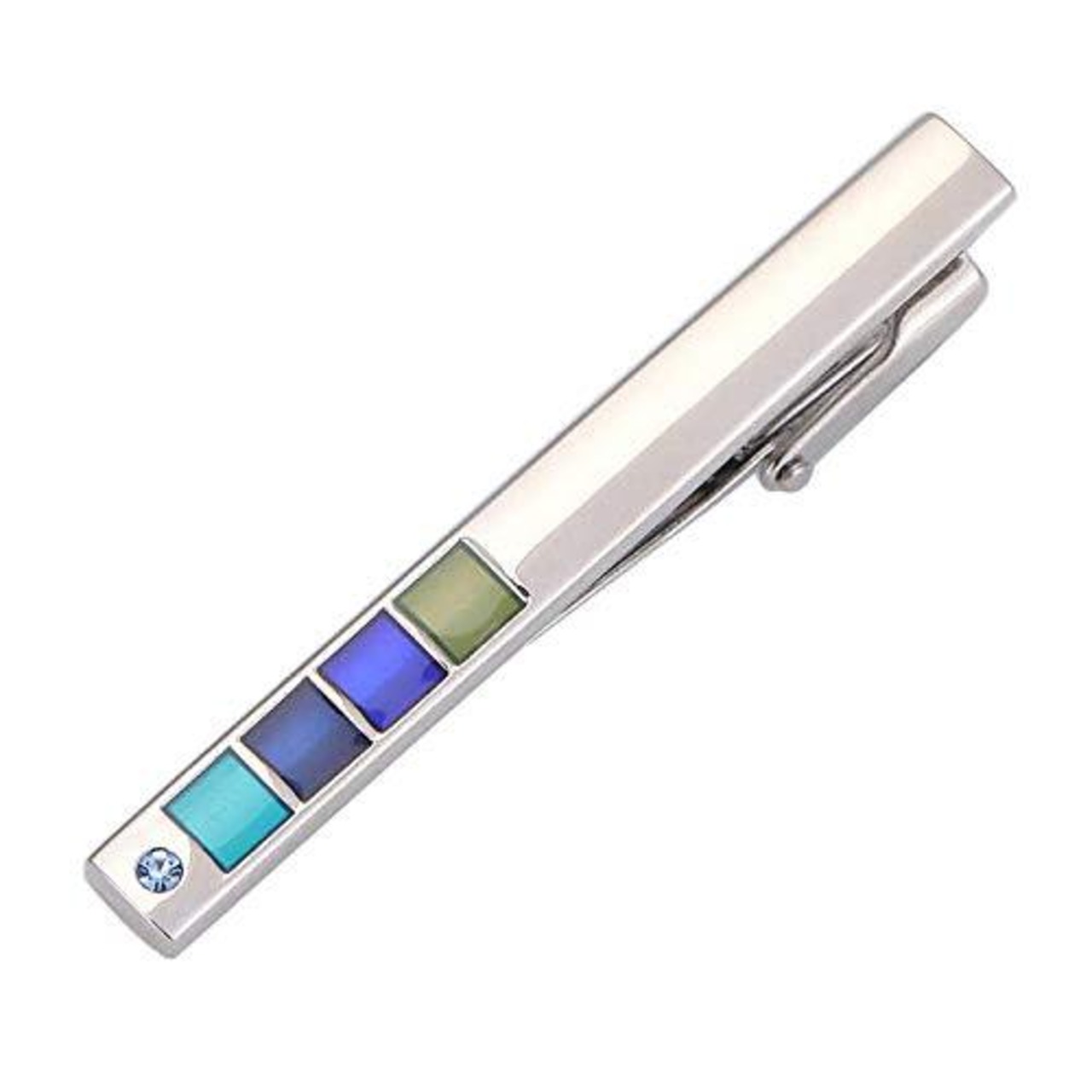 【Rockyu タイピン カフス セット】タイピンはシンプルながら洗練されたデザインで、ブルーとグリーンのエナメルがアクセント。銅製で電鍍シルバー加工が施されており、耐久性と美しさを両立しています。