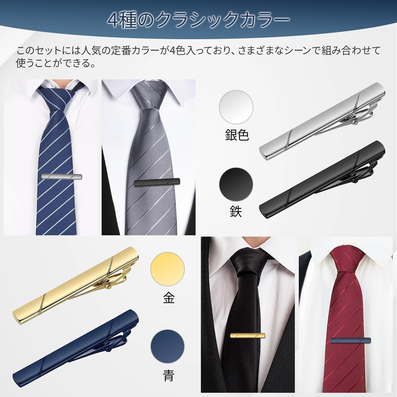 ✨【高級4枚セット】シルバー/ゴールド/ブルー/ブラックの4色ネクタイピンが1セットに。フォーマルからカジュアルまで幅広いシーンに対応。