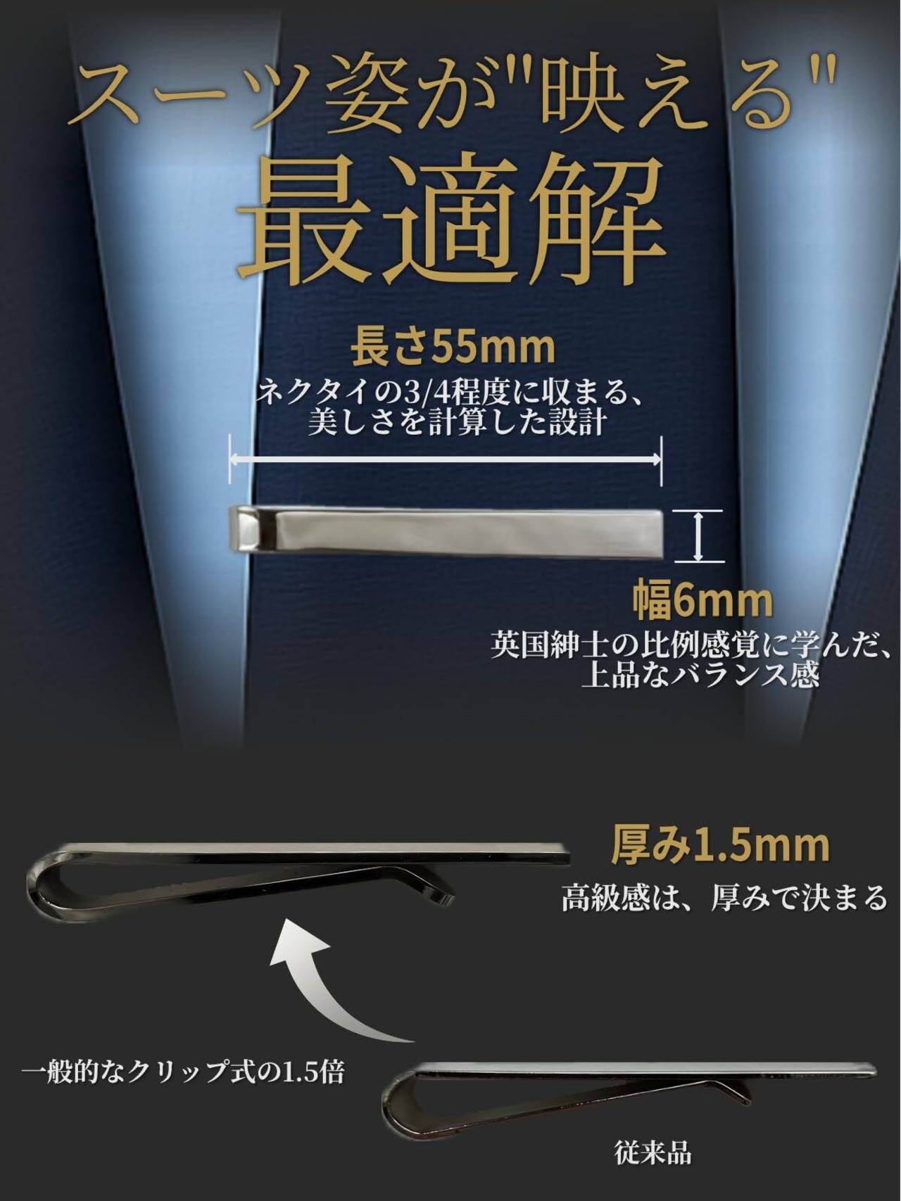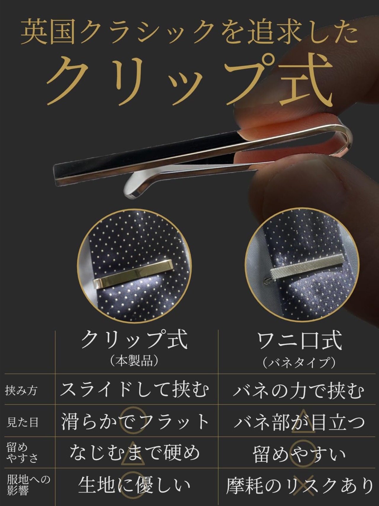 【クリップ式スライド構造】 バネを使用しないクリップ式タイピンで、シャツやネクタイを傷つけにくい仕様です