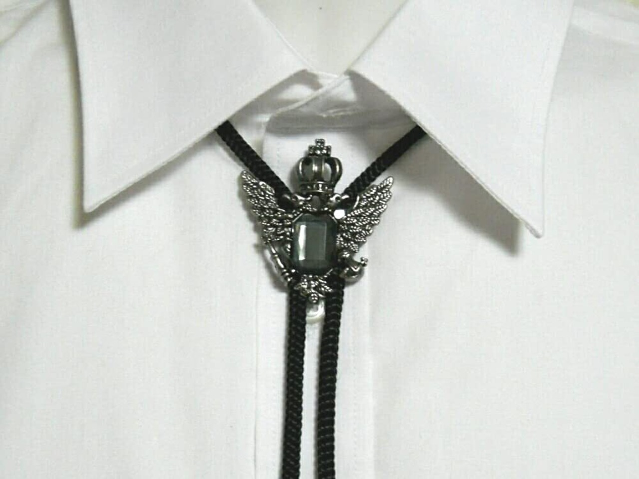 鳥の翼に王冠のエンブレムをモチーフにしたループタイです。 持ち運びに便利なポーチ付きです。