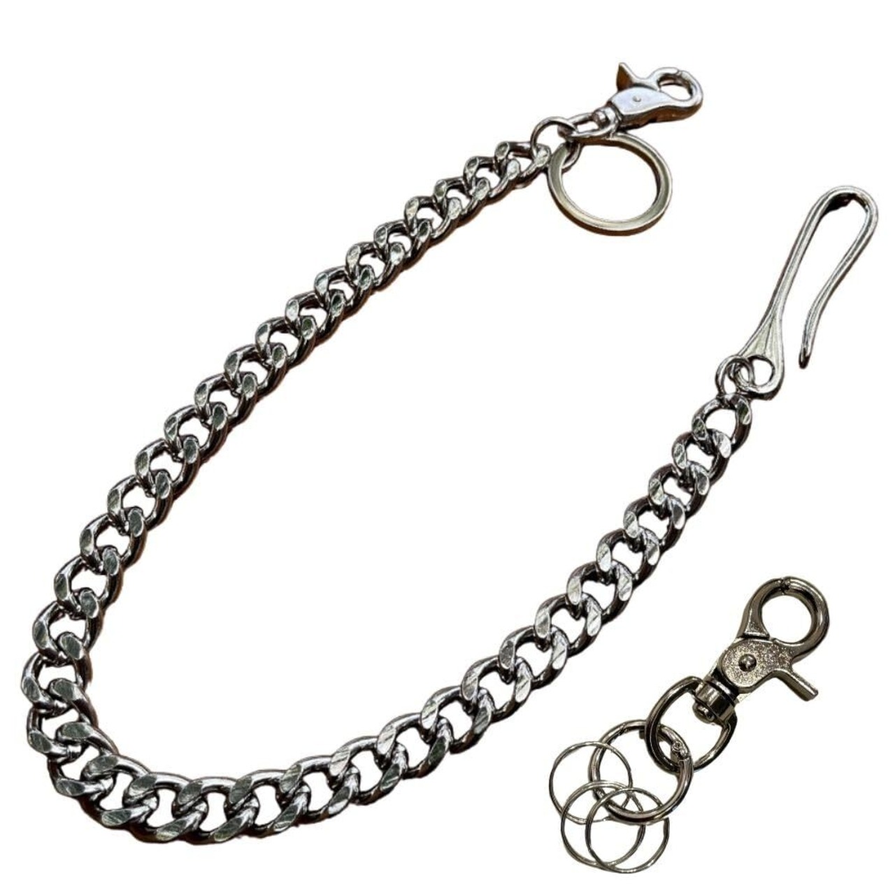 【商品特徴】ベルトに掛けるフックタイプのウォレットチェーンです。シンプルなデザインなため、カジュアル、ストリート、バイカーズファッションのアクセントとしてもぴったり!財布や鍵につなげることで落下、紛失、盗難などの対策にもなります。