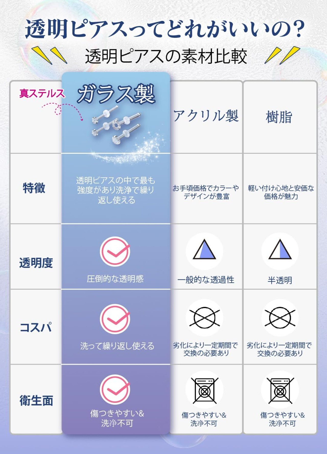 【衛生的な強化ガラス素材】透明ピアス ガラスの針部分は耐熱強化ガラスを採用。シリコン耳栓との組み合わせで金属アレルギー体質でも装着可能です。非吸着性の表面処理が黄ばみや酸化を防ぎ、石鹸水やアルコール消毒で簡単にメンテナンス。ガラス素材の強度はアクリル製品の3倍で、ピアス穴の初期ケアや敏感時の休養期にも最適です。。
