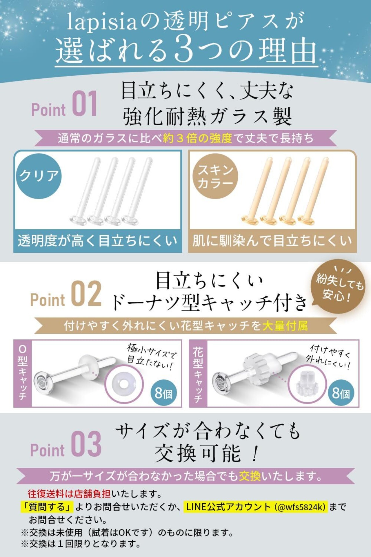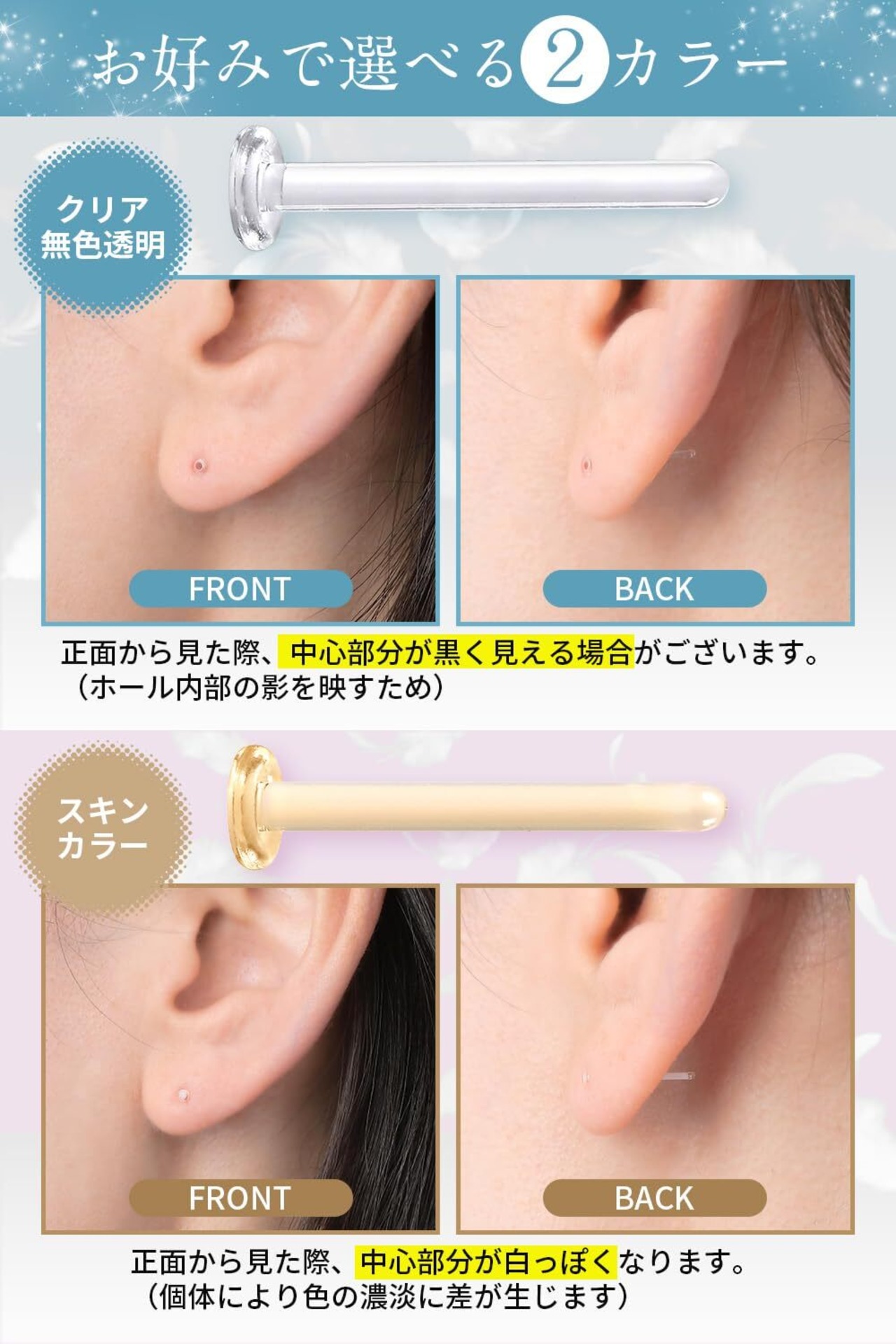 【欲しいサイズが見つかる豊富な36バリエーション】色はクリアとスキンカラーの2種類、太さ(ゲージ)は、20G(直径約0.8mm)、18G(直径約1.0mm)、16G(直径約1.2mm)、14G(直径約1.6mm)、12G(直径約2mm)、10G(直径約2.5mm)、8G(直径約3mm)の7種類から、長さは、約10mm、約12mm、約14mmの3種類から、また形状はストレート、カーブ(長さ12mmのみ)の2種類からお選びいただけます。※試着後サイズが合わなかった場合はお気軽にlapisia公式LINEアカウントまでお問合せください。