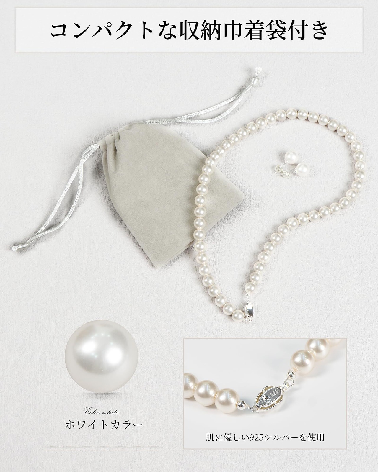 【便利な収納袋付き】使用しない時に便利な収納袋も付いており、パールとシルバーのアクセサリーを大切に保管できます。柔らかな布製の袋は、パールを傷つけることなく、優れた保護機能を持っています。収納袋を使えば、旅行や外出先でも簡単に持ち運びができ、どこでも安全に保管できます。