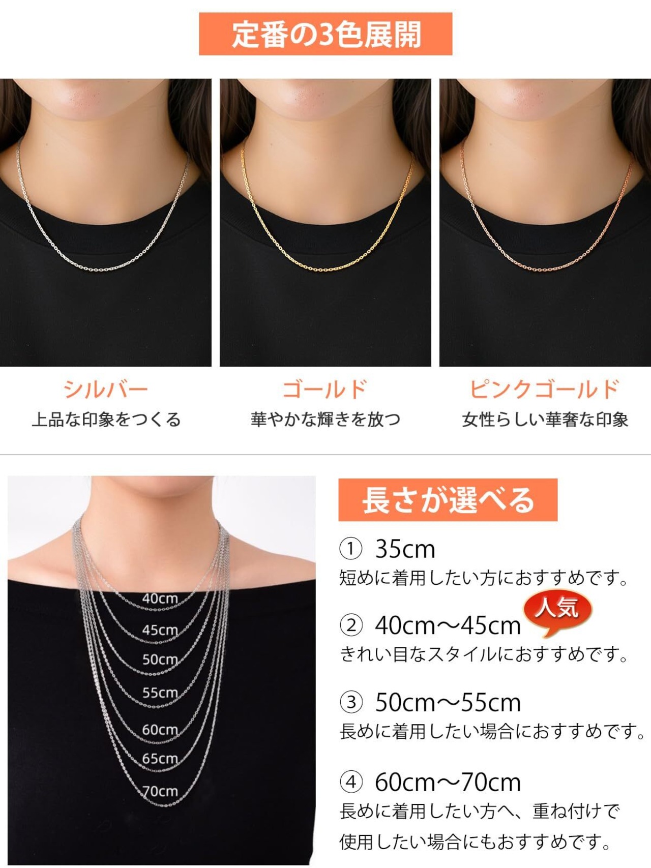 [あずきネックレス] 大人気の小豆チェーンネックレスです。幅は1.5mmで、チェーンの長さは35cm、40cm、45cm、55cm、65cm、75cmの6種類をお選びいただけます。アジャスターが付いているので、+5cmの間でお好みの長さに調節ができます。