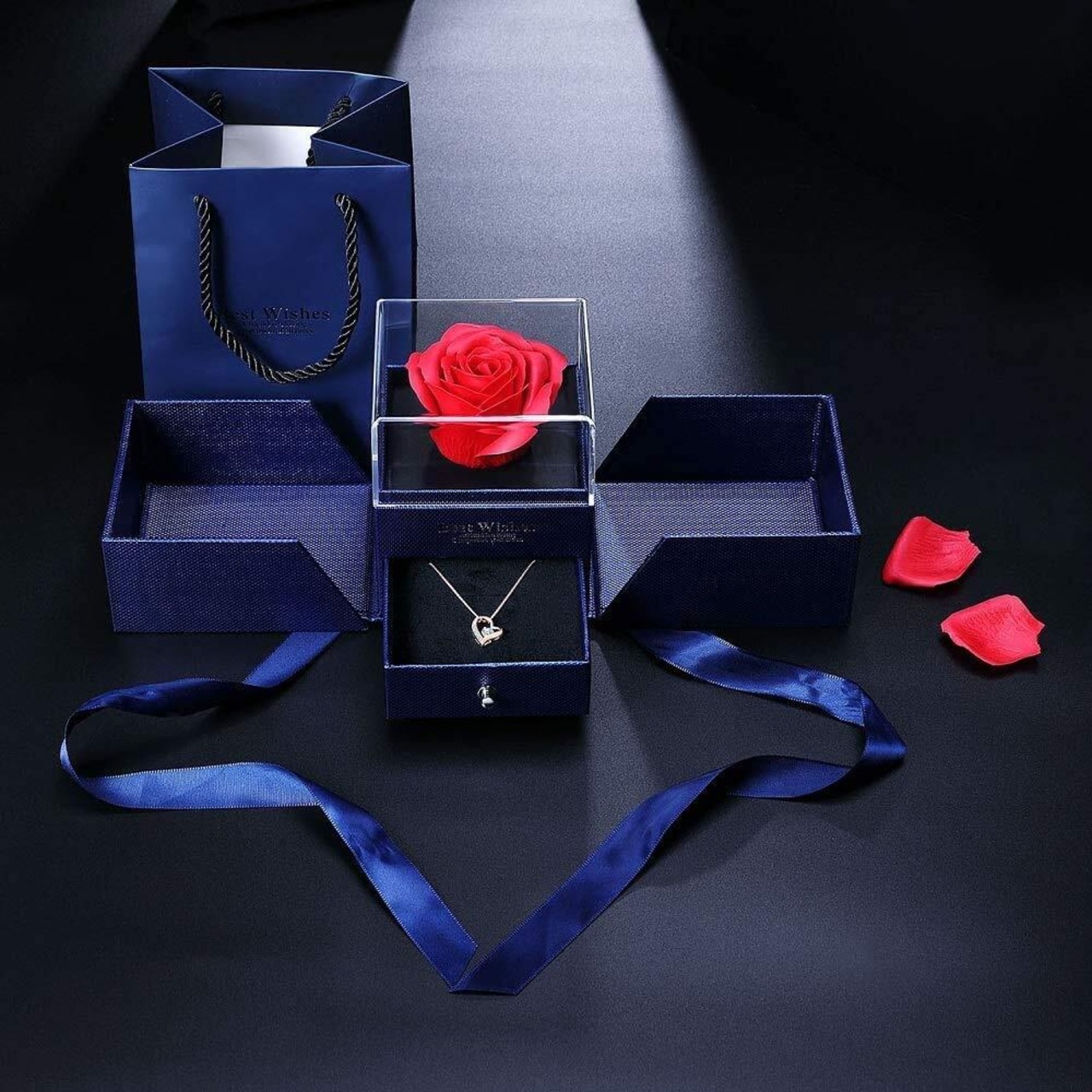 【スワロフスキージルコニア採用レディース ネックレス・プリザーブドフラワーのジュエリーBOX、永遠の愛 】 オープンハート ネックレスと精巧なローズのジュエリーBOXをセットにして、ジュエリーギフトボックスを開けた瞬間に煌く、大輪のローズが見えます、ロマンチックさに徹するデザインとなっています。アイディアに満ち溢れ、愛する人への贈り物として、言葉がなくても伝えられる魅力があります。 さい上級位のピュアブリリアンスカットが施されたスワロフスキージルコニアを採用して、本物のダイヤモンドのようにキラキラです