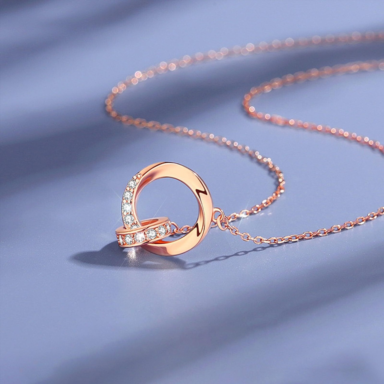 ペンダントネックレス:ネックレスは2つの円で構成され、1つは無限の愛と永遠の約束を象徴する「メビウスリング」、もう1つはきらきら光るジルコン、幸運、誠実、純潔と忠誠を意味し、愛と美の物語を共に綴ります。