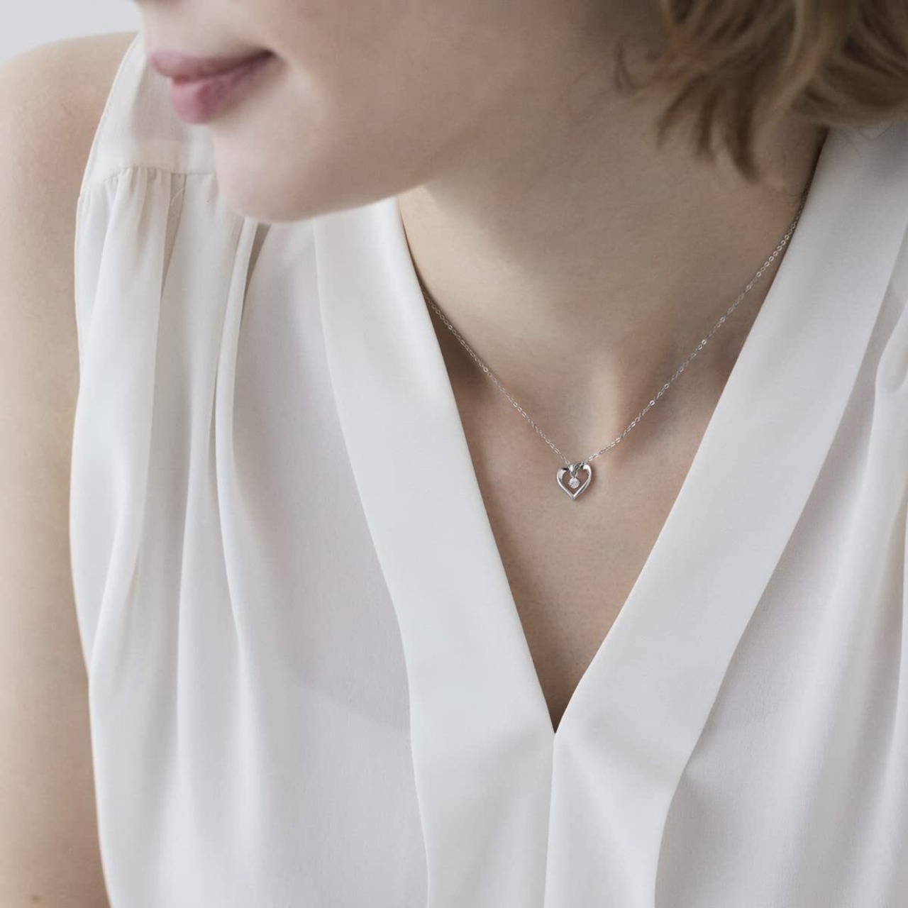 流れるようなラインが魅力的な、愛らしいハートモチーフのネックレス。キュービックジルコニアが揺れながら可憐にきらめきます。ロジウムコーティングの輝きも美しい、上品なデザインです。