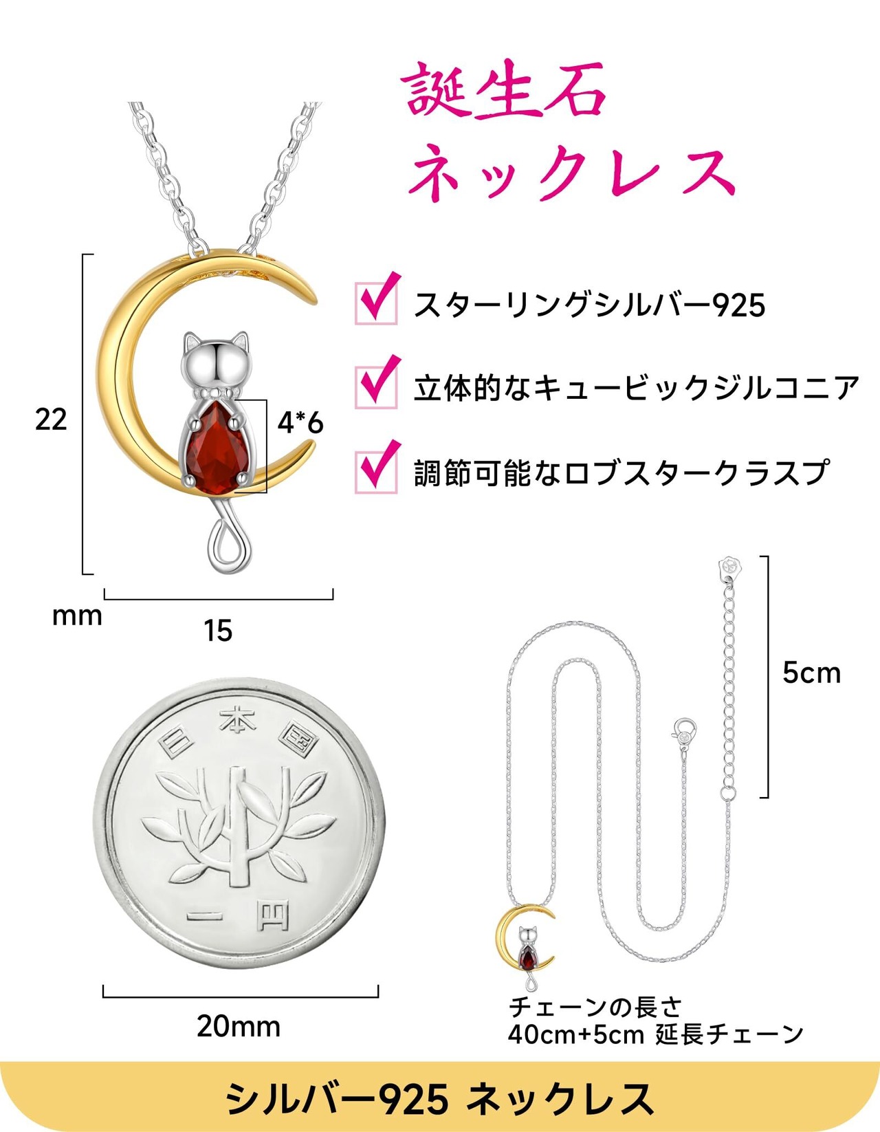 [Just Being Cute] 誕生石 ネックレス, レディース 可愛いねこと月 ペンダント 女の子 プレゼント人気 ネックレス チェーン調整可能 ギフトボックス付け