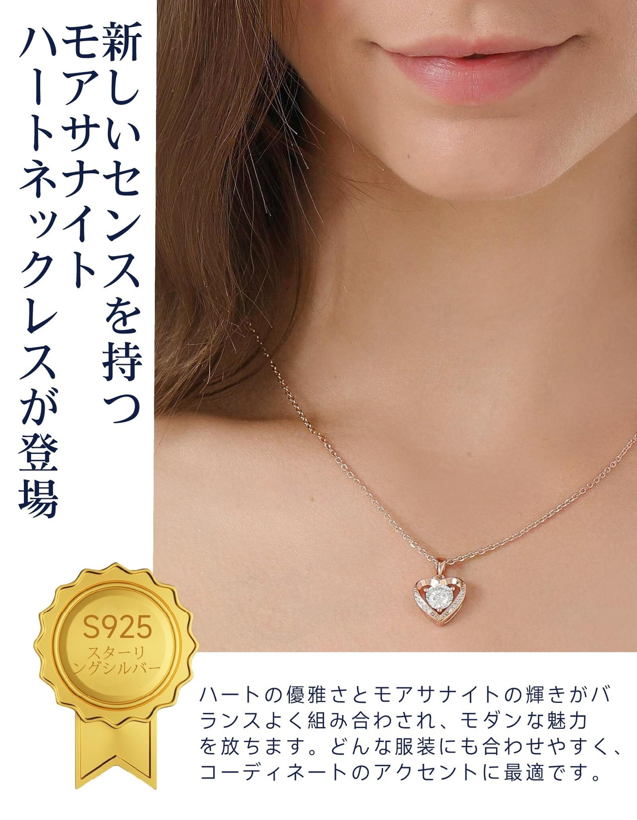 ハート形のデザインは、恋愛、友情、家族の愛など様々な愛の感情を表現するのに最適です。その中心には、輝きのあるモサン石が嵌められており、モサン石の火彩は、ダイヤモンドにも匹敵するほどの美しさを持ち、光の下では眩しい光を放ち、ペンダントをより惹眼な存在にします。