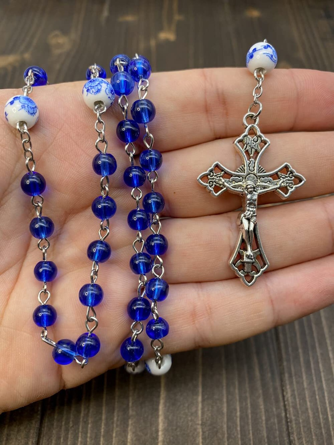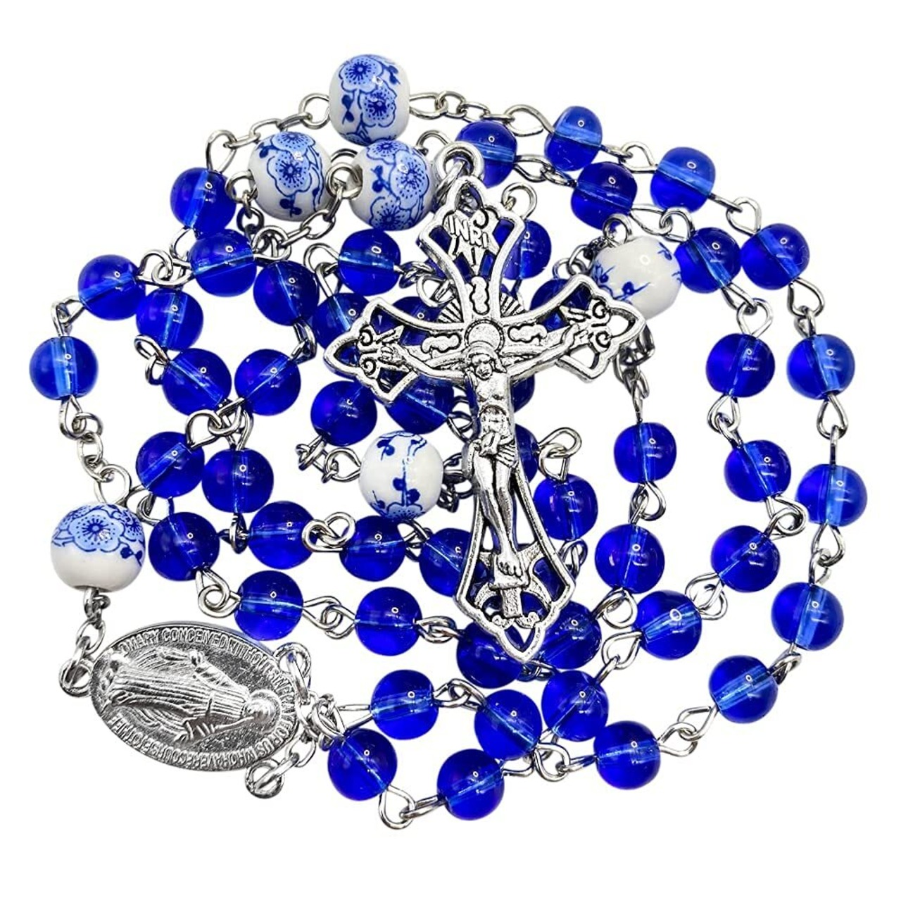 Nazareth Store ブルーガラスビーズ ロザリオ カトリック ホワイトフラワー ビーズネックレス 奇跡のメダル 十字架 キリスト教のギフト ロザリオ, 1.6" x 0.9" x 18.5", 水晶, 宝石なし