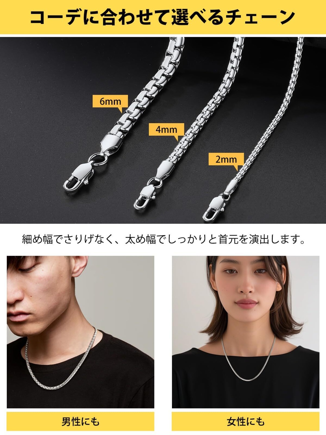 【ネックレスチェーン】シンプルなネックレスチェーンだから、シャツ、Tシャツ、ニットなど、さまざまなトップスと組合わせられます。カジュアルスタイル、スーツスタイル問わず、幅広く活躍できるチェーンです。