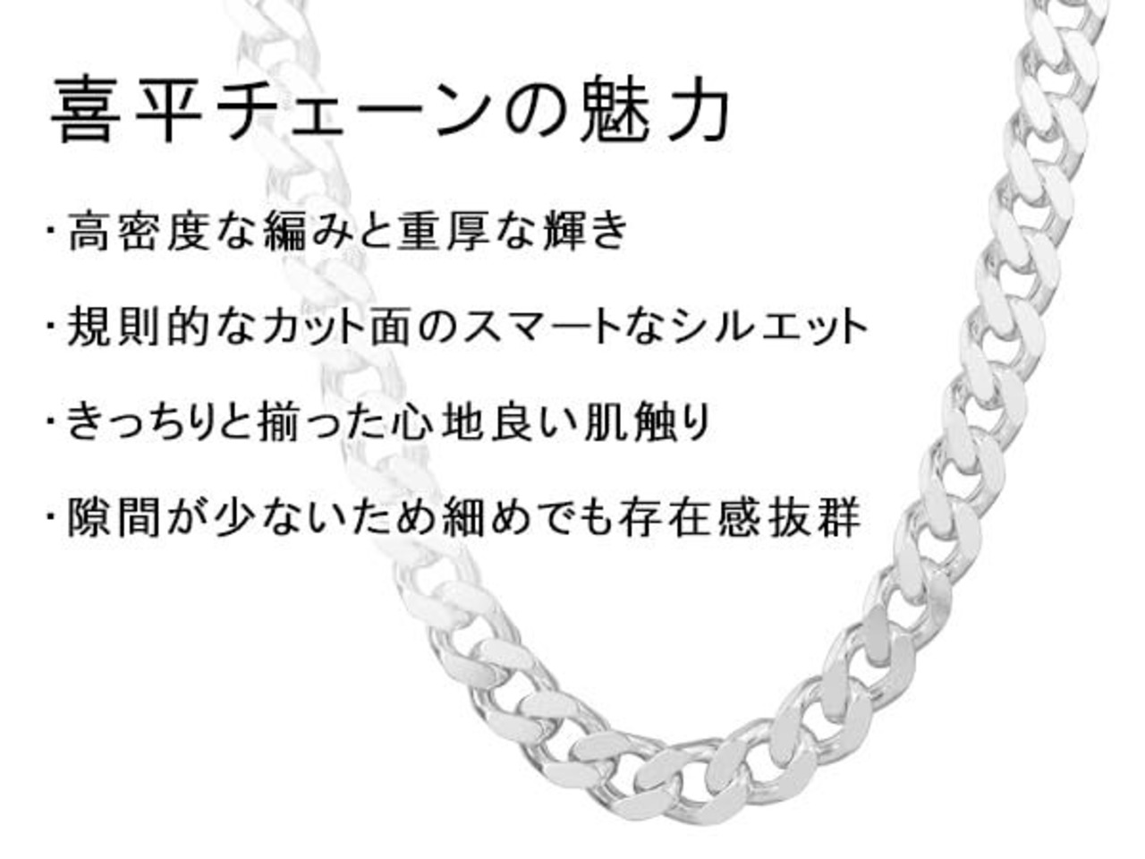 【喜平チェーン】規則的なカット面の輝きとするりとした肌触りが魅力の喜平チェーン。隙間が少ない高密度な編みと重厚な輝きで存在感抜群。チェーン表面が綺麗に並んで同じ面を向くのでかっちりとした印象の独特のシルエットが男女問わず人気です。トップを通すというよりも、チェーン単体でのスタイリングがポピュラーなアイテムとなります。
