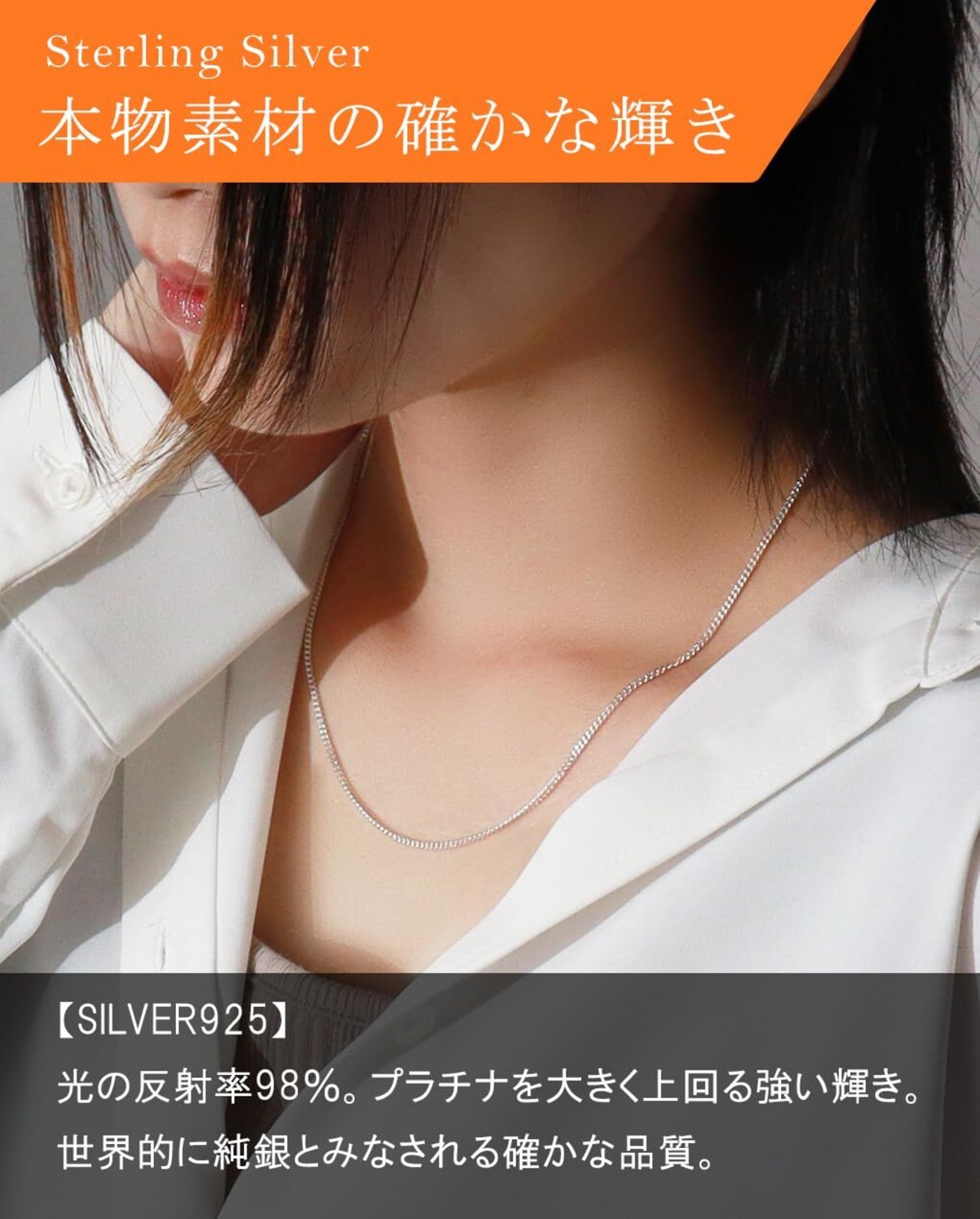 【Silver925素材】シルバーは実は真っ白な金属。SILVER925とは92.5%銀を含んだ銀合金です。他の金属や合金などと比べ、輝きが強いのが特徴で光の反射率は98%とプラチナの60%を大きく上回るほどです。耐久性と輝きの良い状態にするために合金化されたもので、世界のシルバーブランドのほとんどがSILVER925を使用しています。