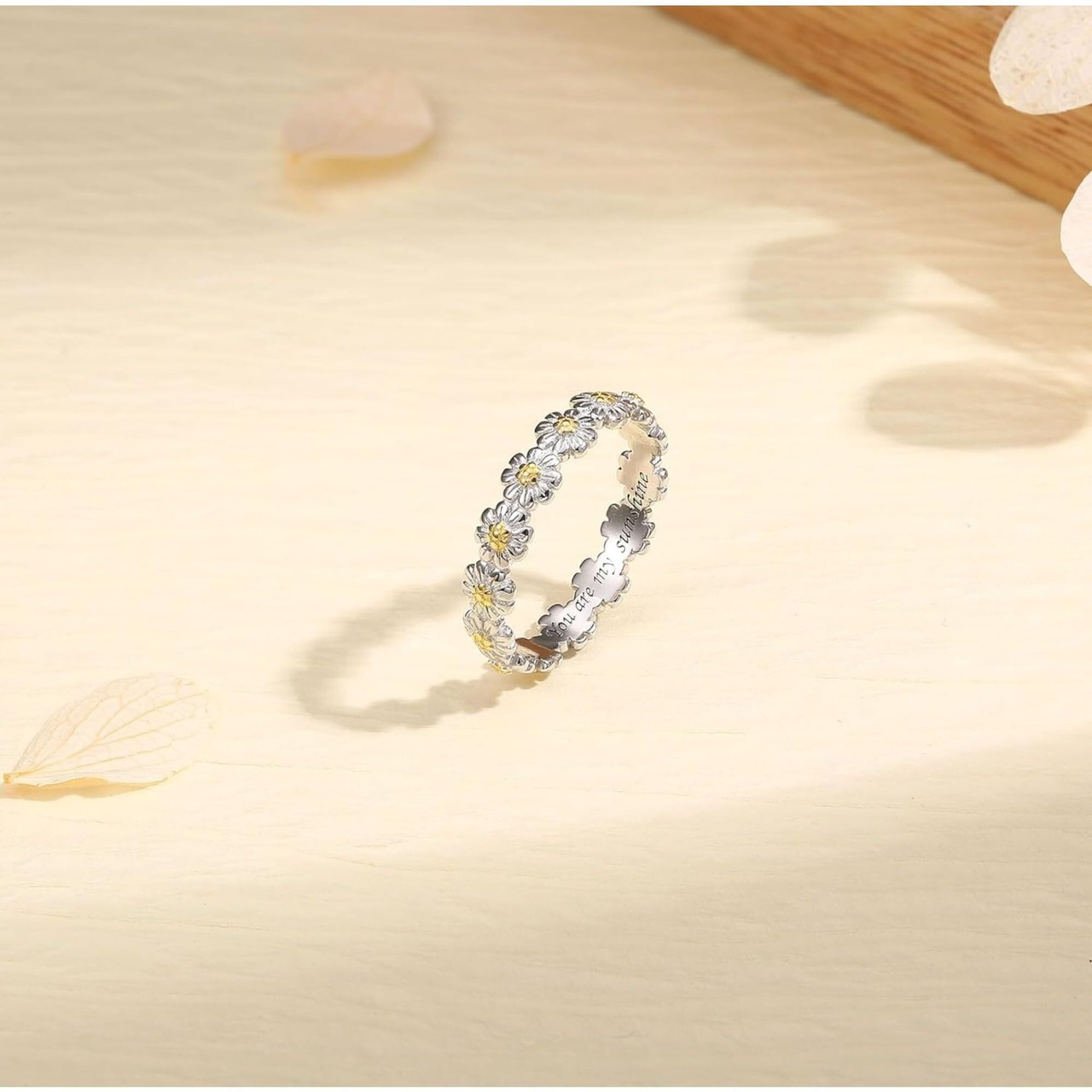 刻印されたフラワーリング バンドの中に隠された温かさと愛情のメッセージを発見してください。 「You Are My Sunshine」という心のこもった言葉が巧みに彫刻されており、デイジーの象徴と組み合わせて、温かさ、幸福、前向きさを意味し、愛する人への理想的な贈り物になります。