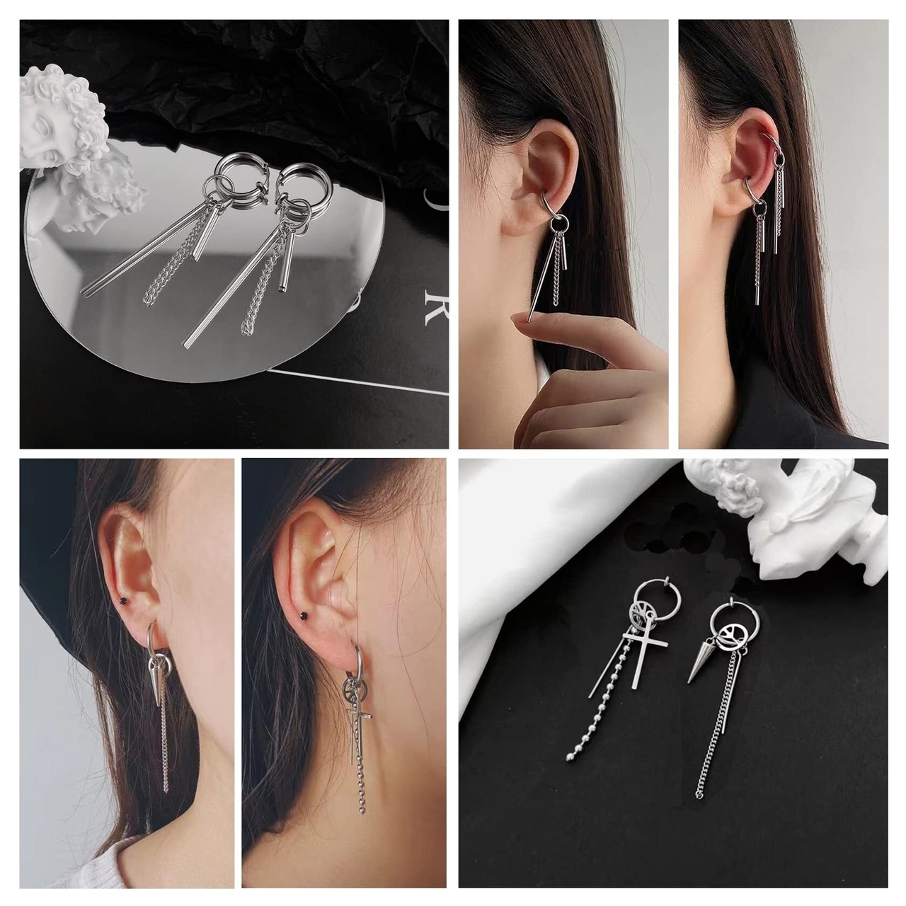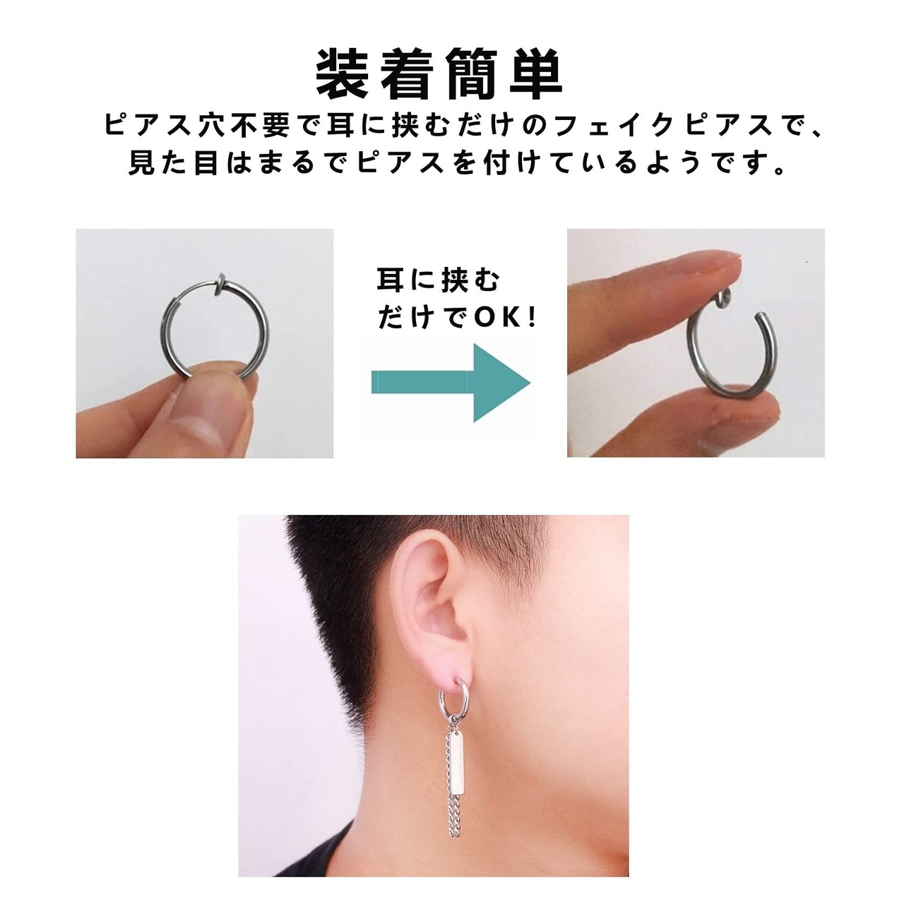 【お得な6ペア&12個セットフェイクピアス】ピアス穴なしでもオシャレに楽しめるイヤリングメンズです。ピアスセットにはシンプルなスティックの揺れるイヤリング、3本のスティックをまとめたフープピアス、フープイヤリングと十字架クロスが付いたイヤリング、2本のスティックとチェーンが付いたイヤリング、チェーンやスパイク、クロス、スティックが付いたフェイクピアス 、3連チェーンにプレートが付いたイヤーカフス、合計6タイプが含まれています。お好みのデザインを楽しめます。フープイヤリングのサイズは内径12mm、外径約16mm、フープイヤリングの厚さは約2mmになります。