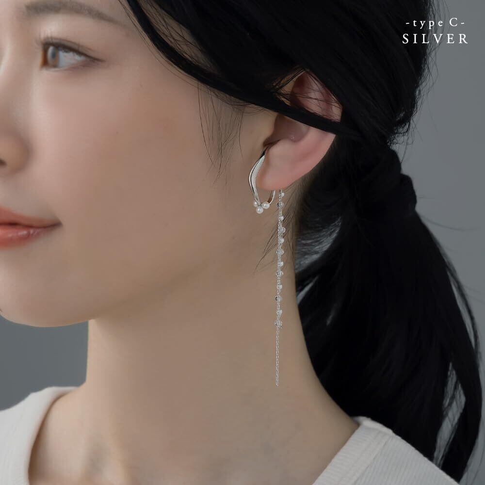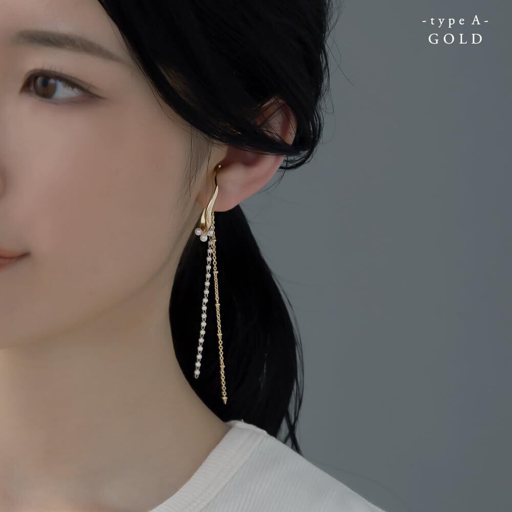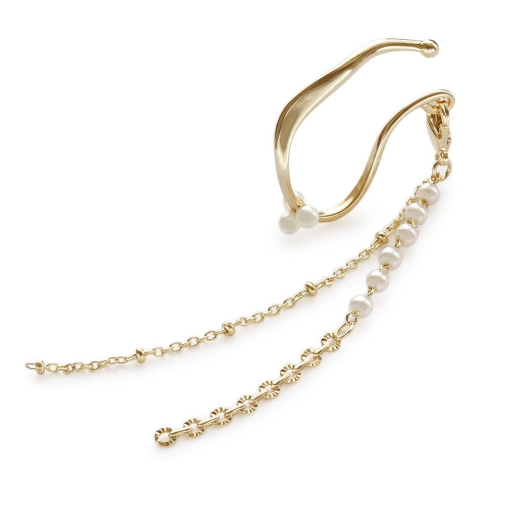 小ぶりで可愛らしい3粒のパールを合わせた上品なイヤーカフにロングチェーンが映えるデザイン。 チェーンは取り外しもできるので、コーデや気分によって2WAYで楽しめます!
