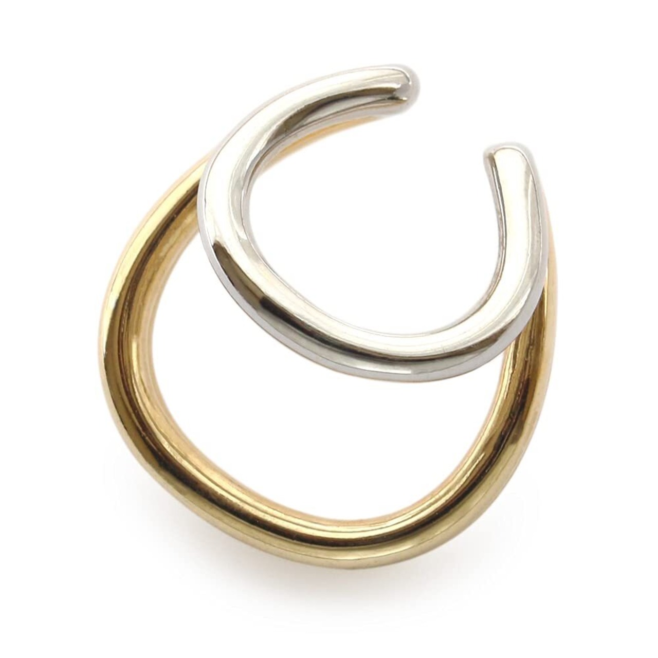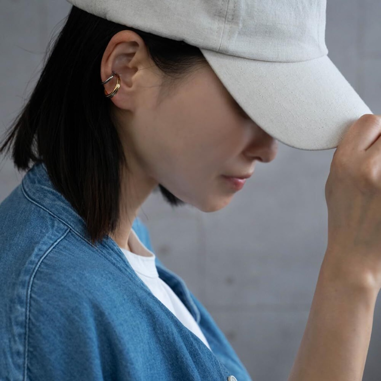 ゴールドとシルバーの異なるリングを合わせた2連風のデザイン。 さりげなく耳元にアクセントを与えてくれる大人のカジュアルスタイルにぴったりなイヤーアクセサリーです!
