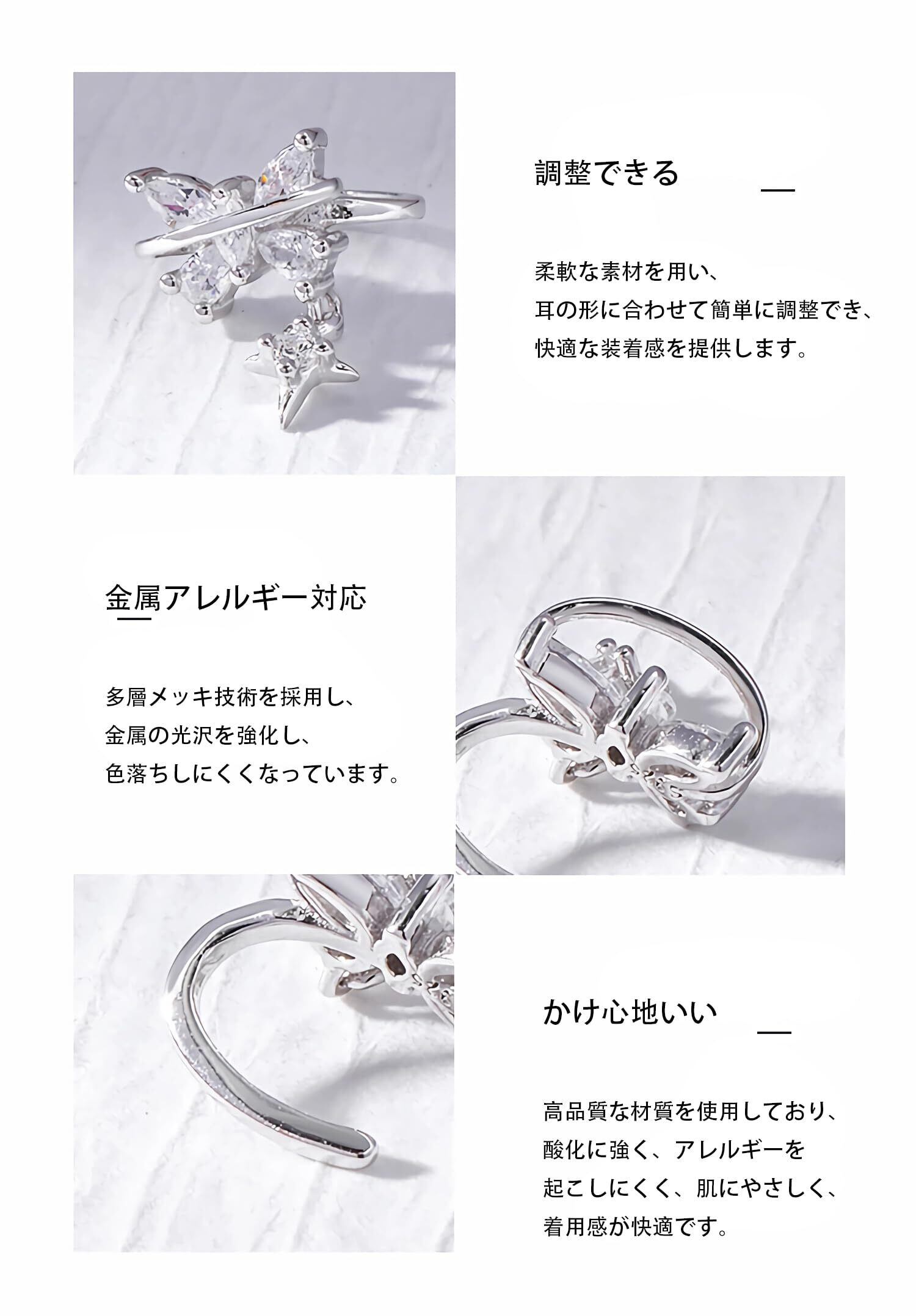 【痛くないイヤーカフ】銅メッキシルバー仕様で肌に優しく、耳の厚さによって調節できます。着脱が便利で、長時間装着しても耳を傷っけることはありません。