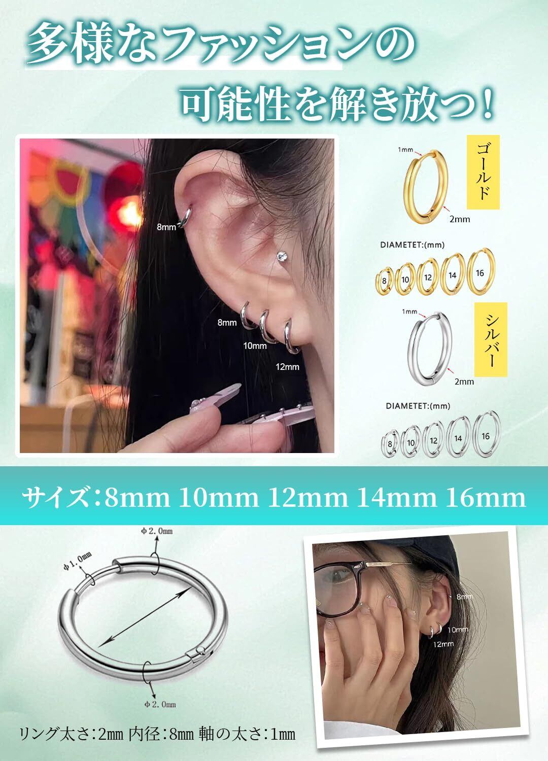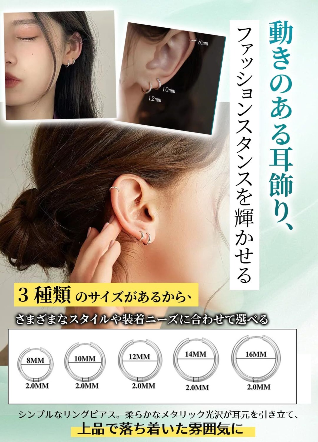 【内容と選択可能なサイズ】内容:ピアス リング 1 対+収納ケース+バッグ+アフターサービスカード 人気のシルバーカラーを採用し、3 種の一般的なサイズをご用意しています。内径 8mm、10mm、12mm です。リングピアスは幅 2mm の標準デザインを採用しており、太さが適度で誰にも似合います。18G(約 1.0mm)の標準針径を組み合わせており、装着感が快適で日常使いにも実用的です。