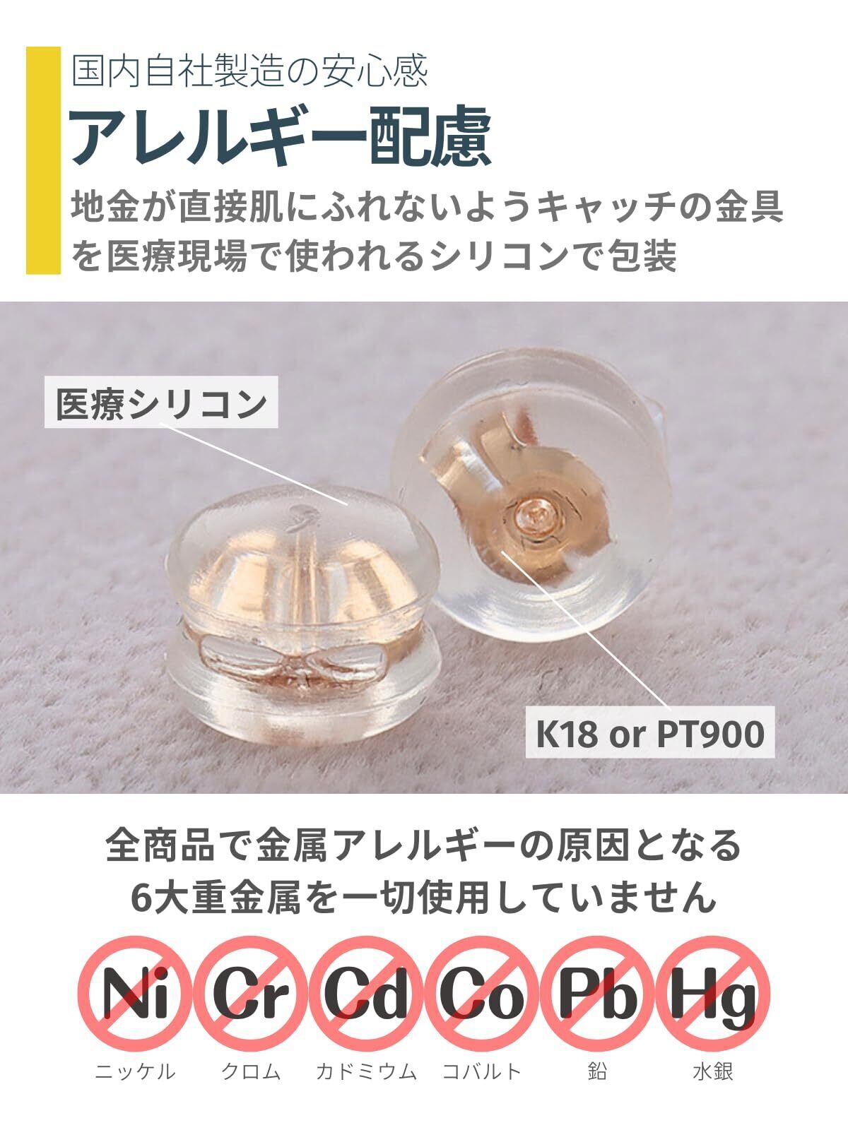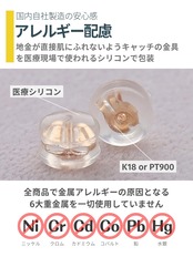 【 金属アレルギー対応・シリコンカバー仕様 】肌に地金が触れないよう、キャッチ全体をシリコンでコーティング。ニッケルフリーで、アレルギーを引き起こしやすい有害金属も不使用です。金属アレルギー対応ピアスキャッチをお探しの方に最適!