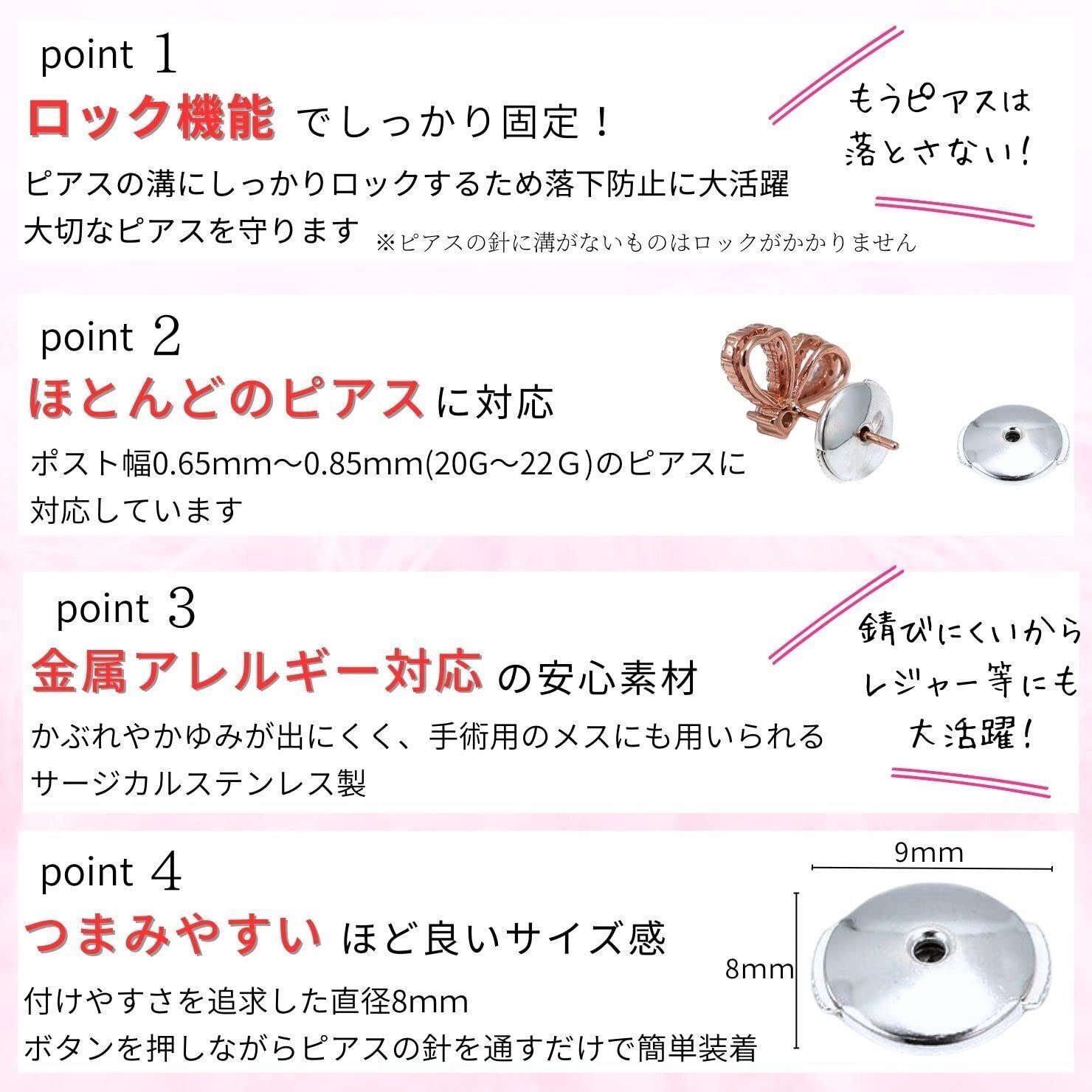 【もうピアスは落とさない!】ロック機能付きのピアスキャッチで大切なピアスを失くすストレスを解消します。また、奥まで差し込むことでピアスの下向き防止にも大活躍のおススメのキャッチです。