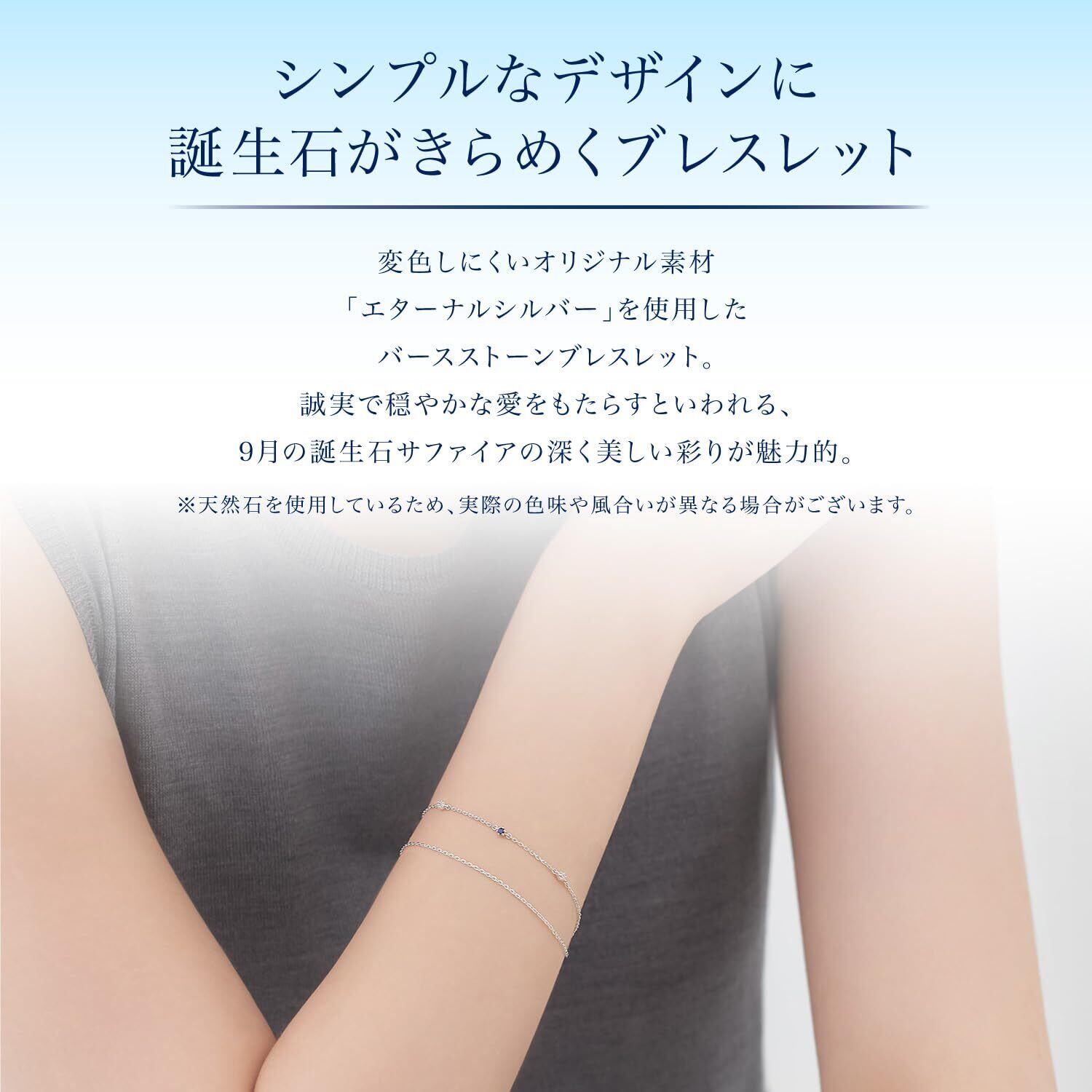 変色しにくいオリジナル素材「エターナルシルバー」を使用したブレスレット。9月の誕生石のサファイアと、キュービックジルコニアが華やかさを添える、爽やかで上品な印象のデザイン。ほどよいボリュームの2連のチェーンが女性らしい華奢な手元に。※天然石を使用しているため、実際の色味や風合いが異なる場合がございます。