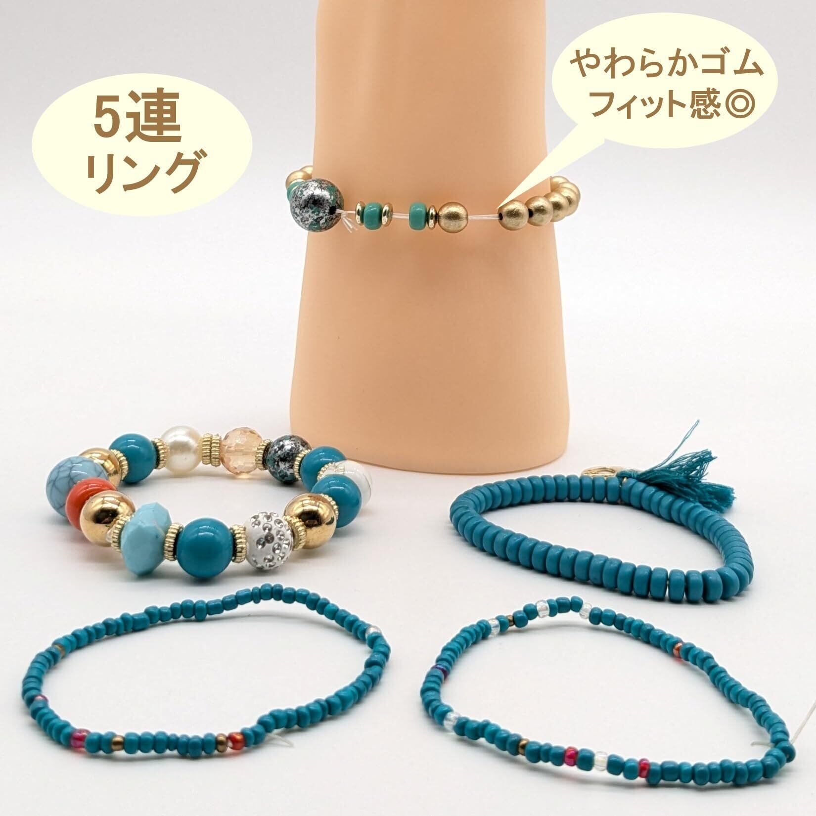 ターコイズカラーがきれいで、目を惹く、異素材パーツのデザインが特徴のブレスレットは手首まわりをおしゃれに可愛くしてくれるアイテムです。