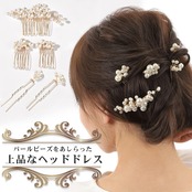【ヘアアクセサリーに最適】ゴールドの土台にパールを装飾した高級感のあるアクセサリー。5点セットで髪を留めながらもサイズ違いのパールを散りばめれます。