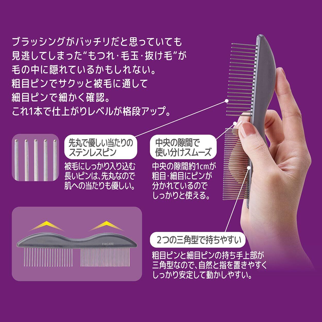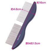 ●先丸で優しい当たりのステンレスピン:被毛にしっかり入り込む長いピンは、先丸なので肌への当たりも優しい。●中央の隙間で使い分けスムーズ:中央の隙間約1cmが粗目・細目にピンが分かれているのでしっかりと使える。●2つの三角型で持ちやすい:粗目ピンと細目ピンの持ち手上部が三角型なので、自然と指を置きやすくしっかり安定して動かしやすい。●抗菌剤配合