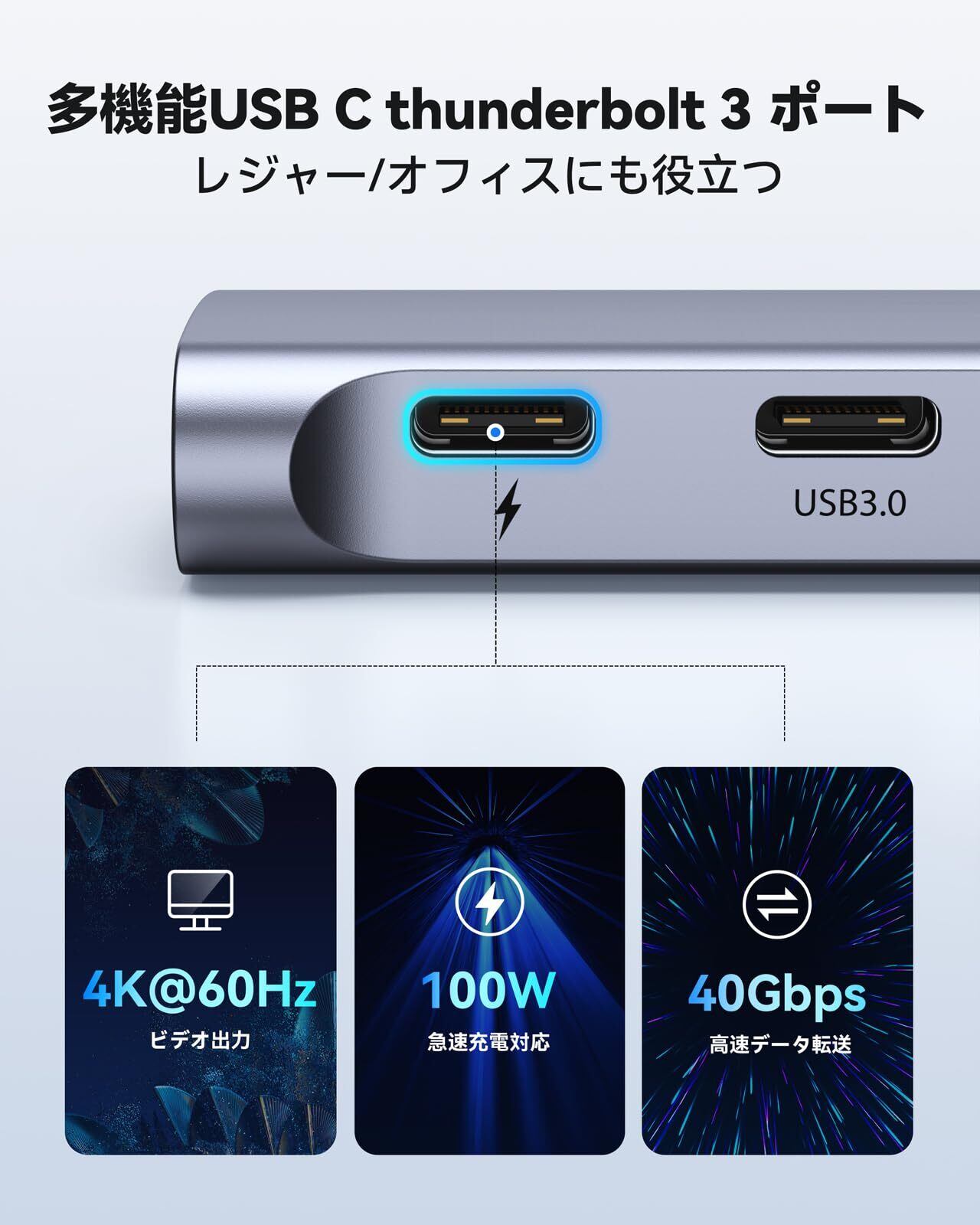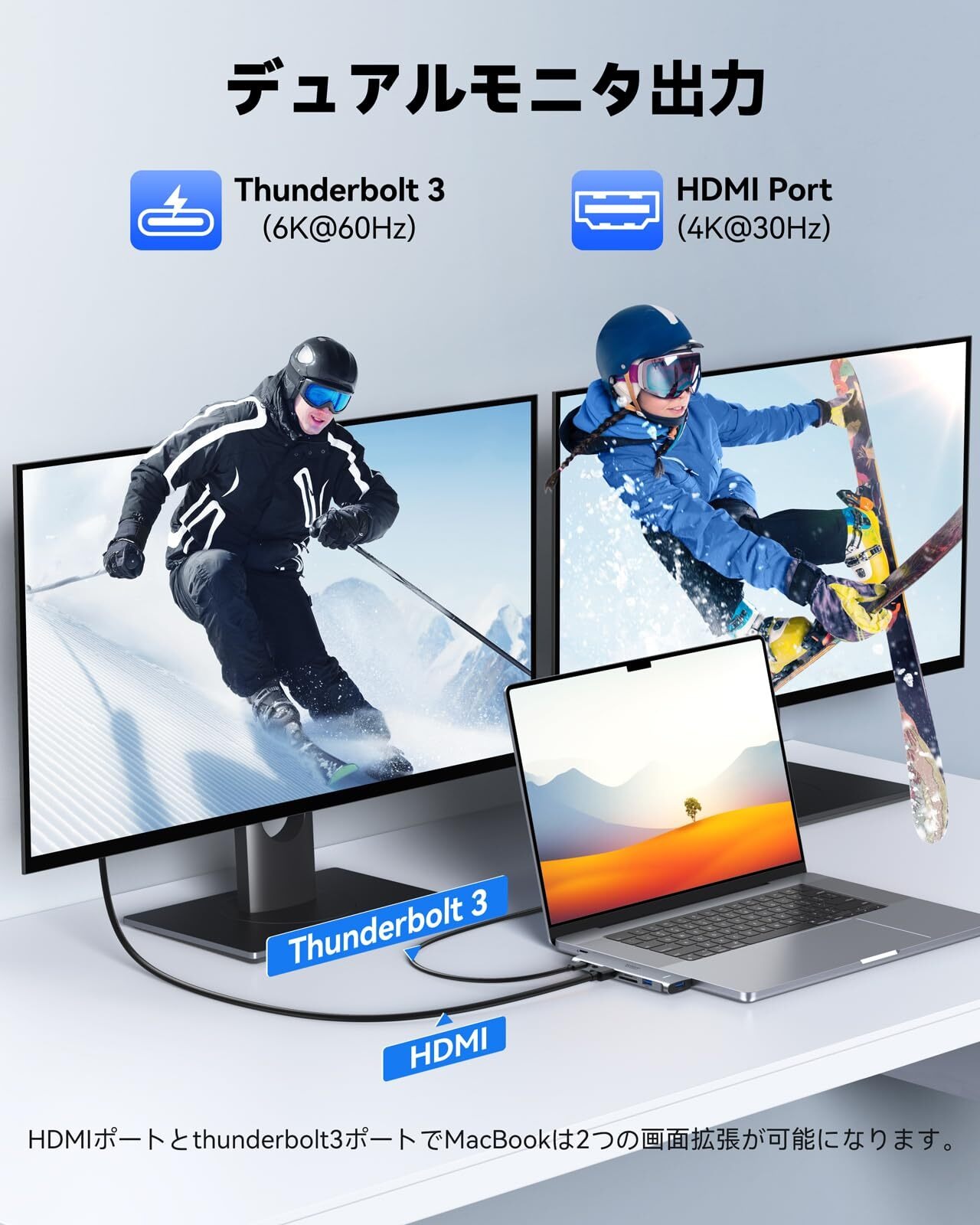 【複数の外部モニターに接続usbハブ type-c&驚きほどの視覚体験】このmacbook ハブはUSB Type-C多機能Thunderbolt 3ポートとHDMIポートを併用すれば、複数の外部モニターに映像出力が可能。多機能Thunderbolt 3ポートは5K@60Hzの映像出力に対応しており、HDMIポートは4K@30Hzの映像が出力できます。USB Type-C充電ポートを映像出力で利用した際はパススルー充電ができませんが、マルチディスプレイ環境を構築したい場合にも便利です