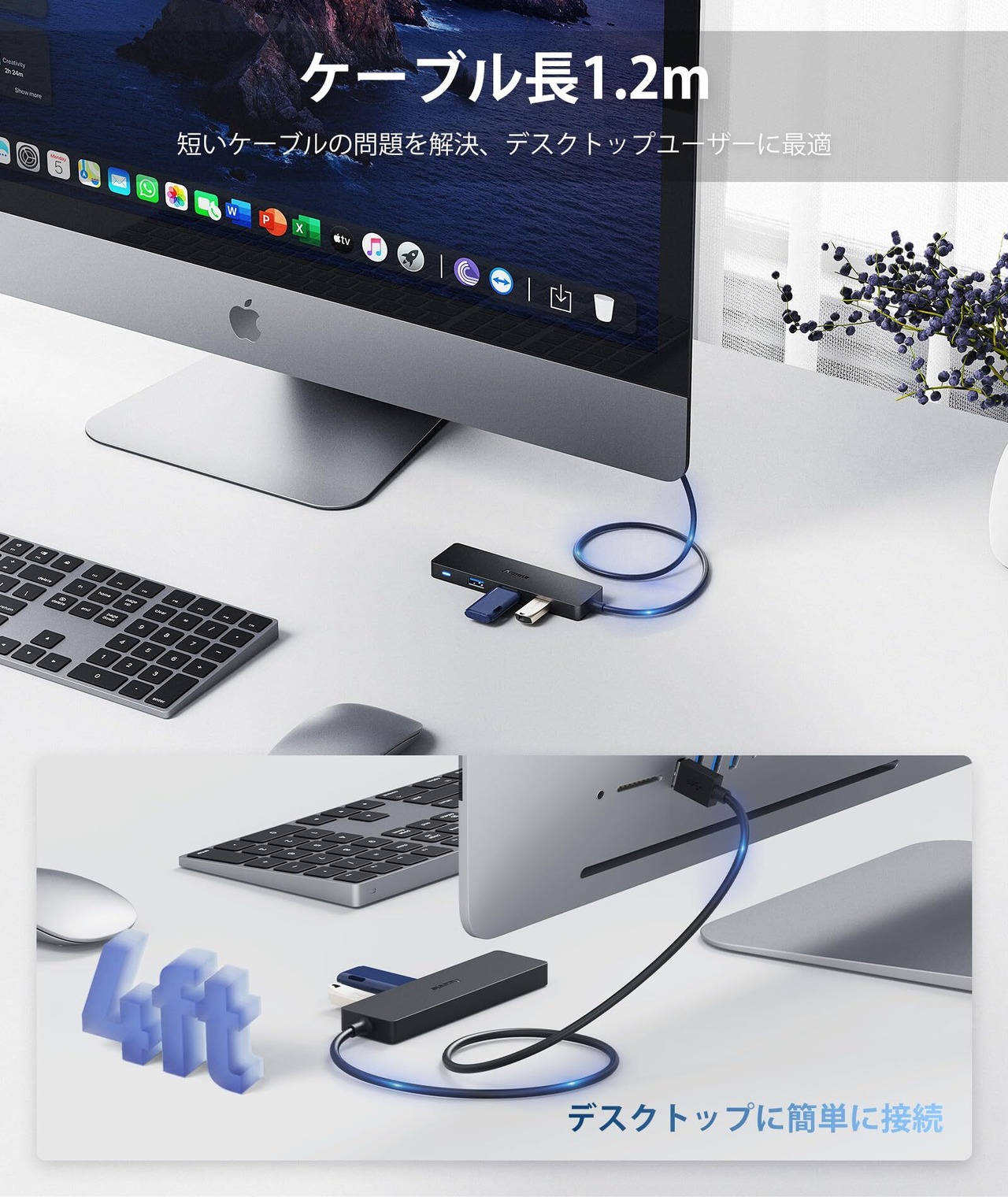 Aceele USB ハブ 拡張 4 USB ポート120cm 延長ケーブル 5Gbps 超高速 軽量 PC MacBook/Chromebook Windows/Mac対応 USBハブ テレワーク リモート 在宅勤務に最適