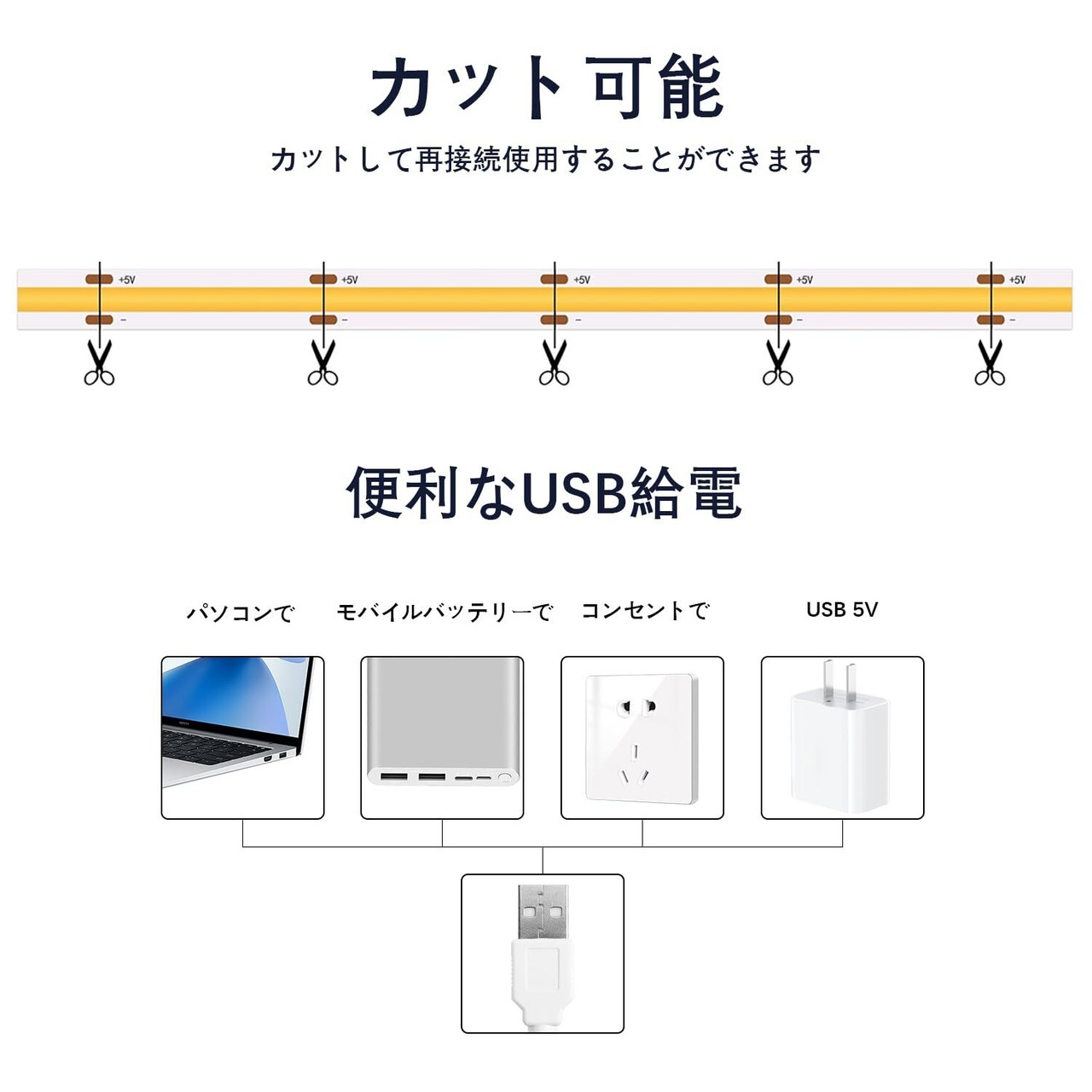 ShineBurky ledテープライト COB 高密度 usb給電 2m テープ照明 10段階調光 320LEDs/m カット可能 両面テープ設置 高輝度 テープライト cob 電球色