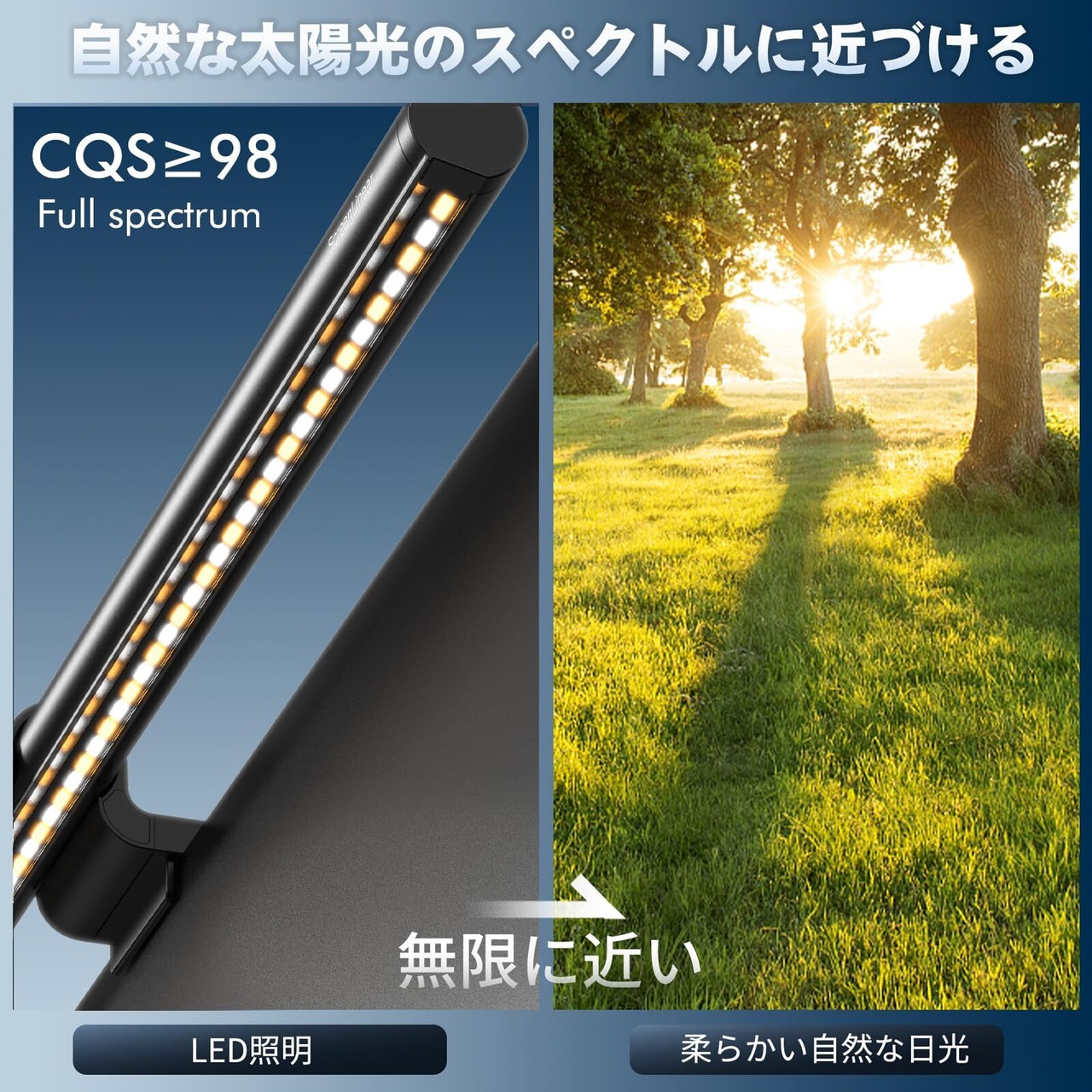 【非対称配光&光阻止フード】 バーライト採用した非対称な光学設計により、前面の照明はデスクトップ作業エリアだけを照らし、独特な光阻止フードデザインとバーライトの外観により、目に入る光を最大80%削減し、目を保護。また、内部の光板のデザインに加えて、輝度を集中させ、照度を最大40%向上させることができる。4種類の色温度(2700K-3300K-4100K-5200K)、無段階明るさ調光機能、およびバックライト照明は、さまざまな照明ニーズに対応できる。
