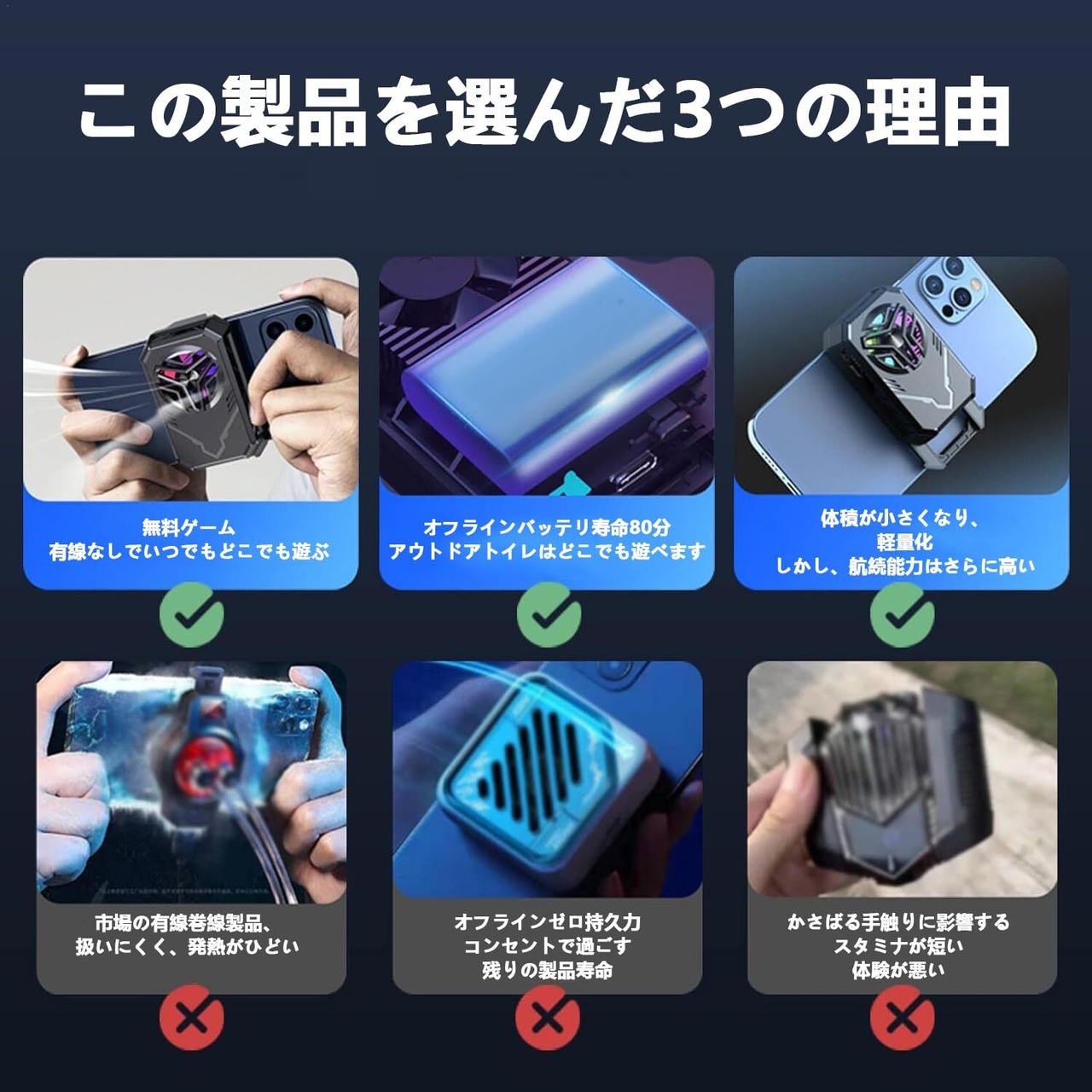 【快適な使用体験】:スマホクーラーコンパクトなデザインで、MOBA 、FPSなどのゲームをする時に、ゲームの操作の邪魔になりません。伸縮可能なクリップには滑り止めシリコンが付き、しっかりスマホに固定されて、携帯電話を傷つけることはありません。iPhone/Huawei/Sony/Samsung/Xperiaなど5-7.3インチのスマートフォンに対応できます。(背面がアーチ形状のスマホでの使用はお勧めいたしません)