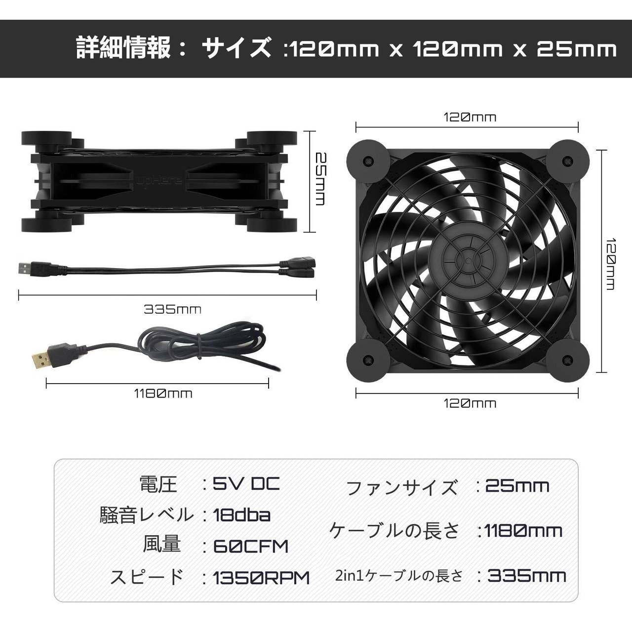 upHere 12cm USB冷却ファン USB扇風機小型 ミ ニ送風機 PC冷却ファン 2基連結 1350RPM 静音タイプ【N12U03】