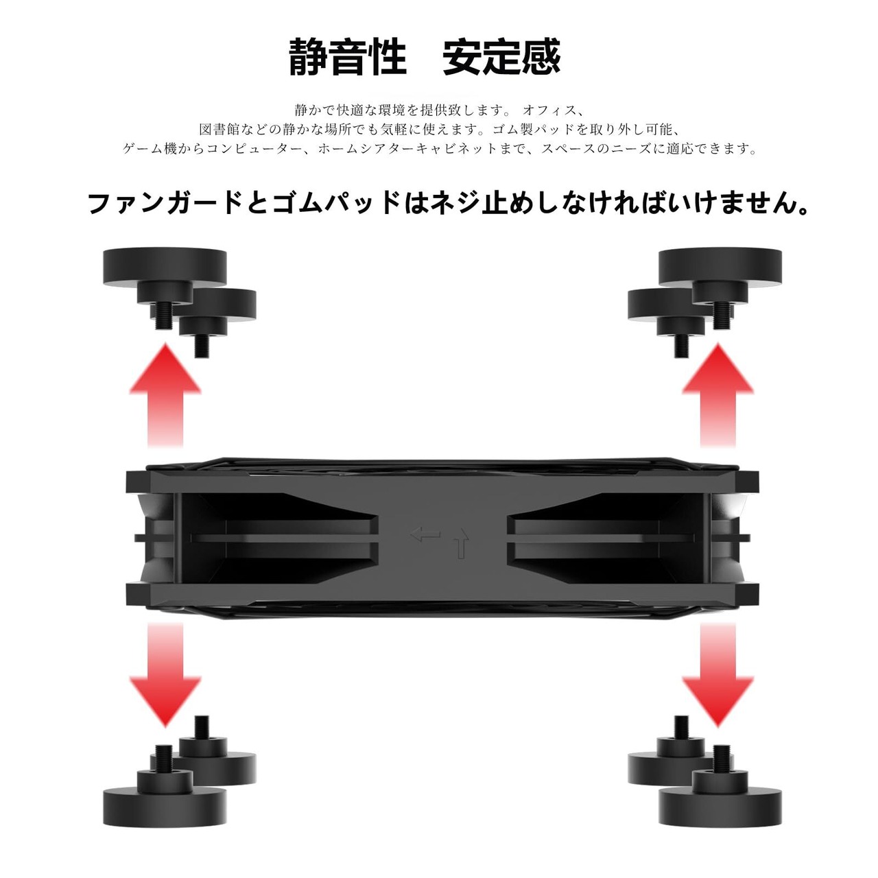 【静穏性設計】usb小型ファンには大きなゴム足搭載、二つ送風ファンでは合計16個の防振ゴム足が両面ファンガードに固定されており、シリコン製の緩衝パッド付きで、音や振動を抑えるだけでなく、滑りにくさも兼ね備えています。自習室、図書館などの静かな場所に使っても、気になりません。 軽量でコンパクトの設計により、空間を取らず、持ち運びと収納が便利です。狭い場所でもご利用いただけます。